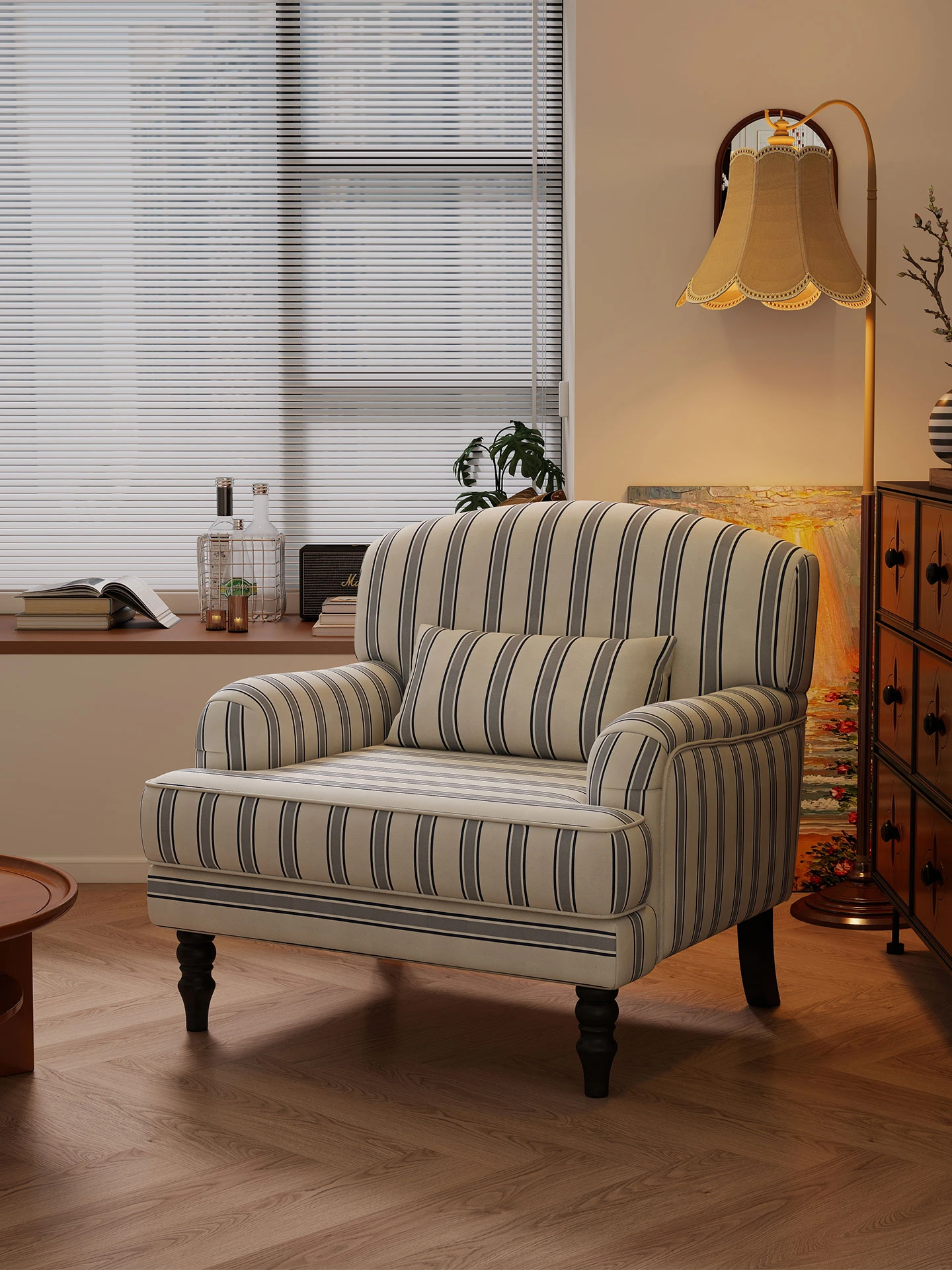フレンチヴィンテージスタイルの一人掛けソファチェア - リビング、バルコニー、寝室に最適なコンパクトデザイン。高級感漂うトラ模様で、リラックスタイムを演出します!
