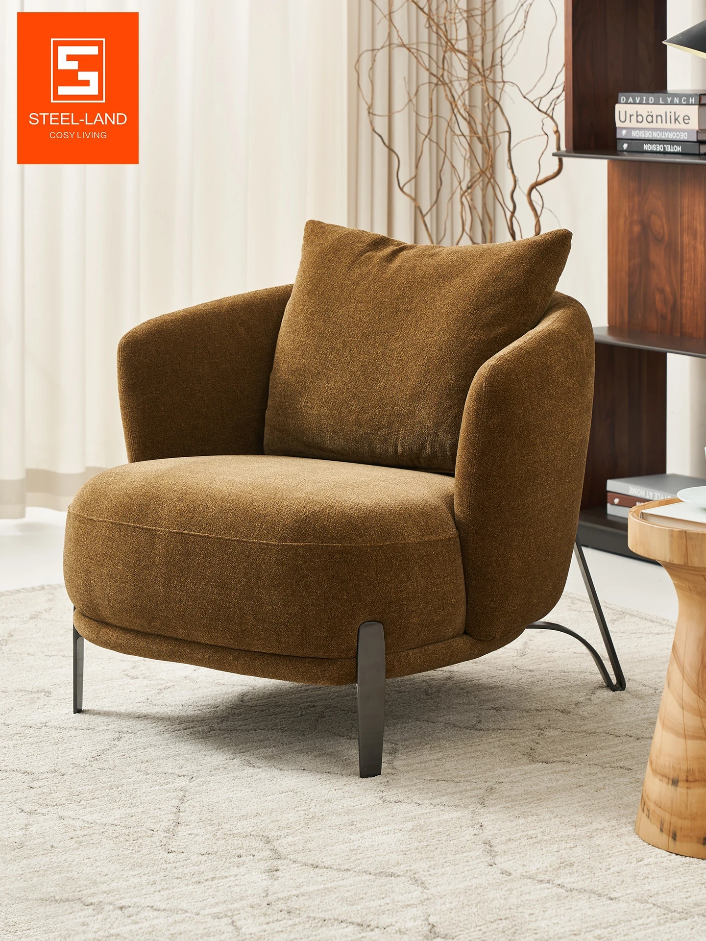 スティロランの云ラインファブリックリビング一人掛けソファチェア - ラグジュアリーなデザイン、コンパクトな小型住宅に最適な背もたれ付き椅子。上質なひとときを提供します!
