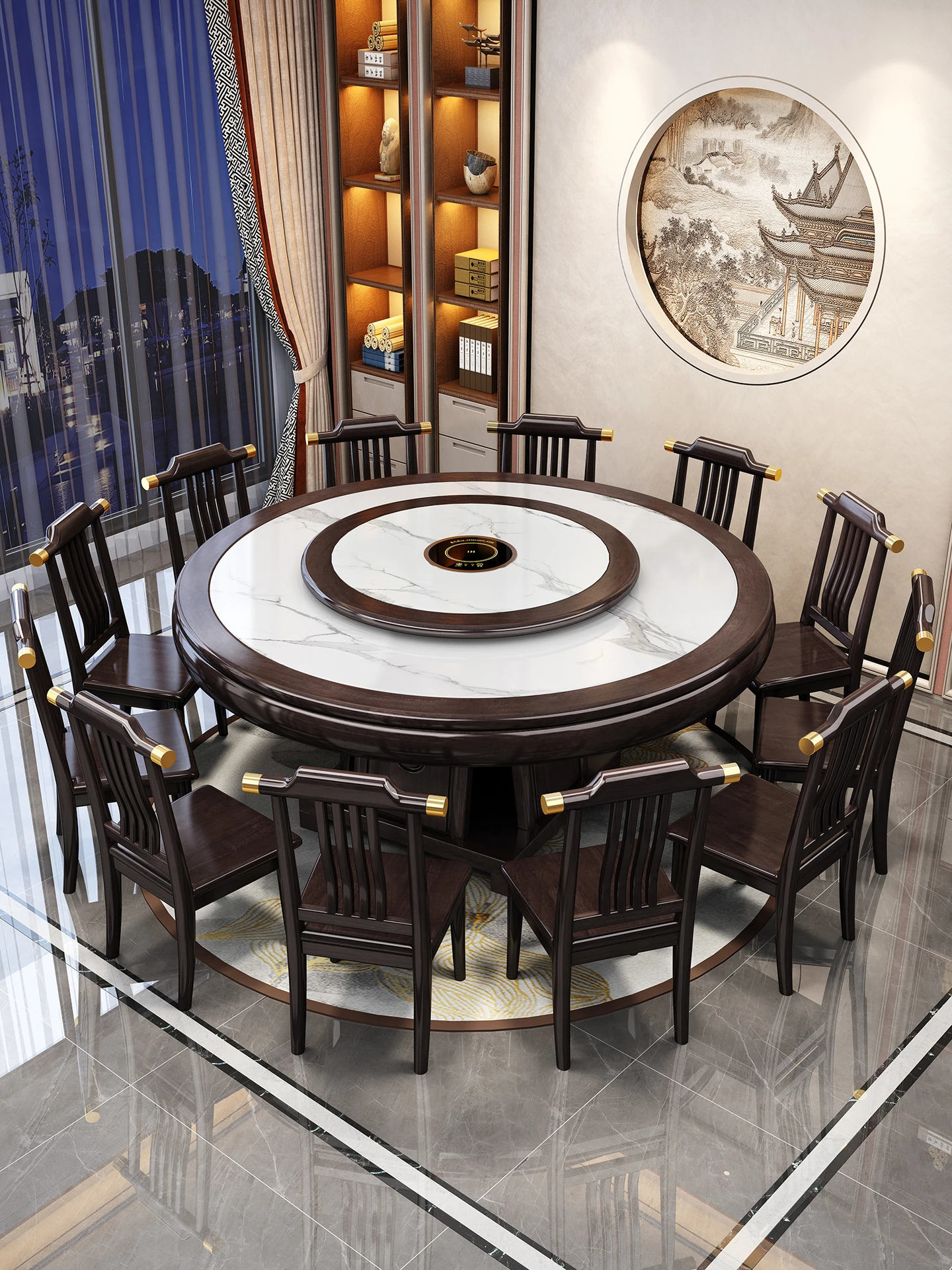 新中式スタイルの天然木製大円卓、回転プレート付き!家庭用ホットポットにも最適なダイニングセット、快適な椅子付きで、家族や友人との心温まるひとときを演出します。