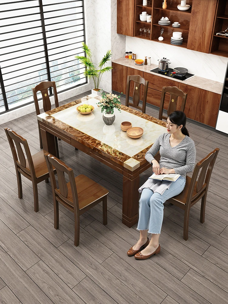 モダンでシンプルな大理石長方形テーブルセット|実木製ダイニングテーブル&チェアコンビ|小さな家にもぴったりの食卓で、家族や友人との楽しいひとときを演出!