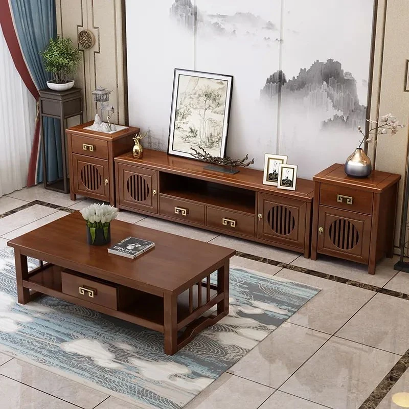 Zen-inspired New Chinese Solid Wood TV Stand and Coffee Table Set - Elegant Vintage Living Room Low Storage Cabinet for a Touch of Luxury and Serenity