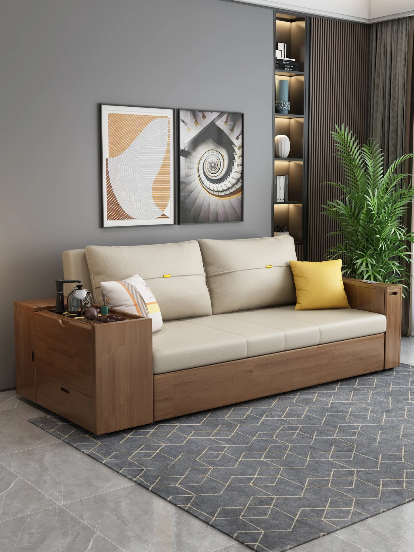 Versatile New Chinese Style Solid Wood Sofa Bed - Foldable 2-in-1 Design with Tech Fabric, Armrests that Double as Tea Cart