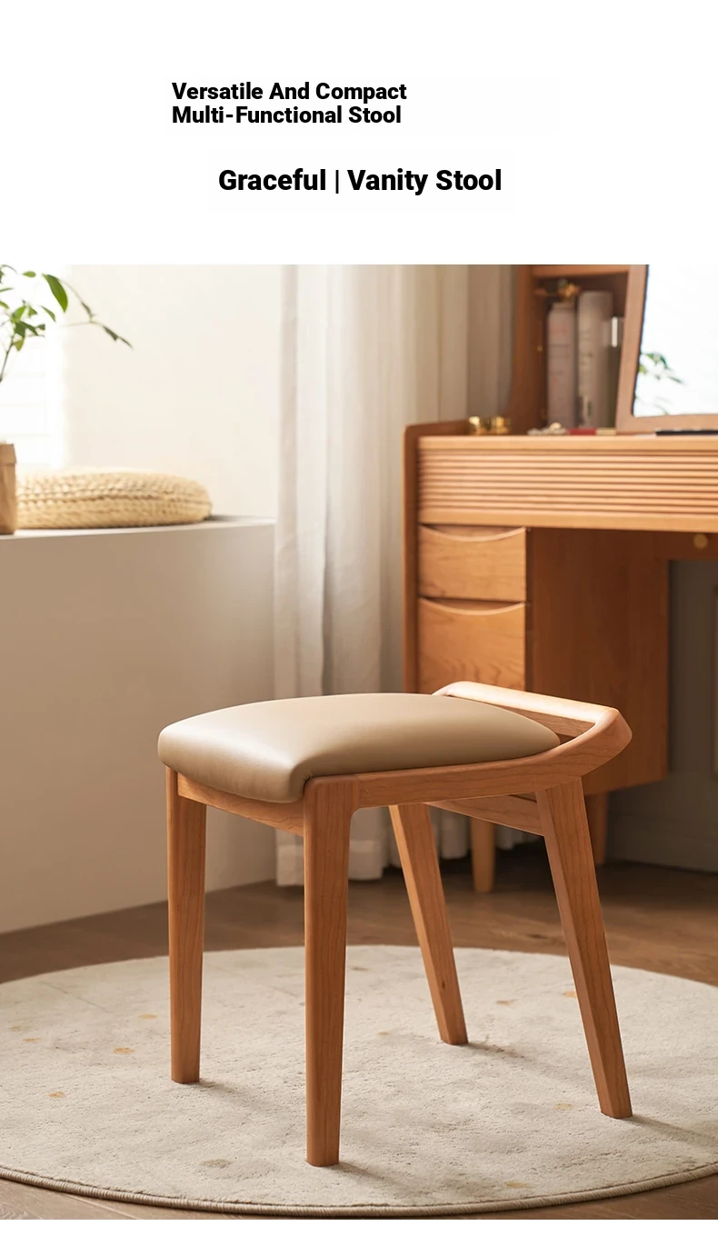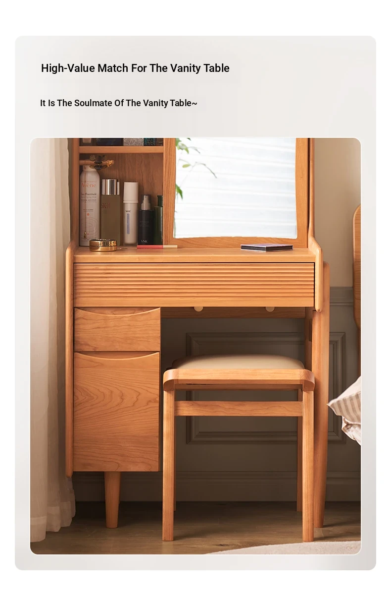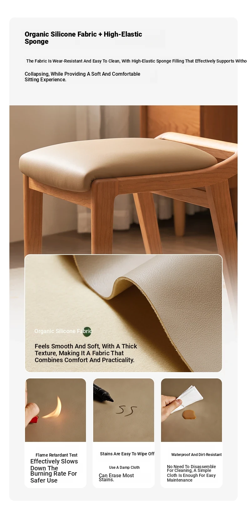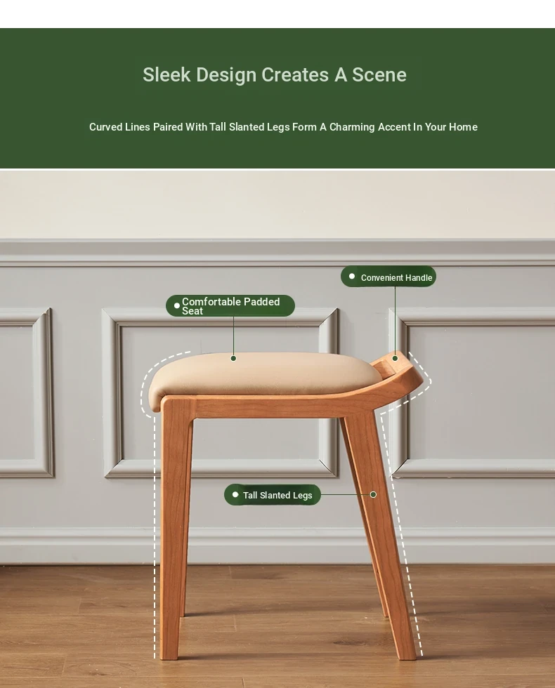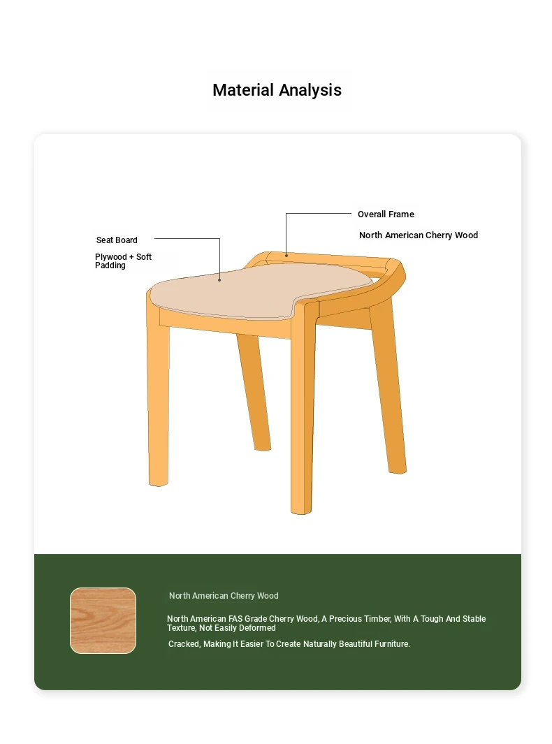Nordic Solid Wood Vanity Stool - Modern Minimalist Cherry Wood Upholstered Seat, Perfect for Small Spaces, Ideal for Bedroom, Dining, and Makeup Use