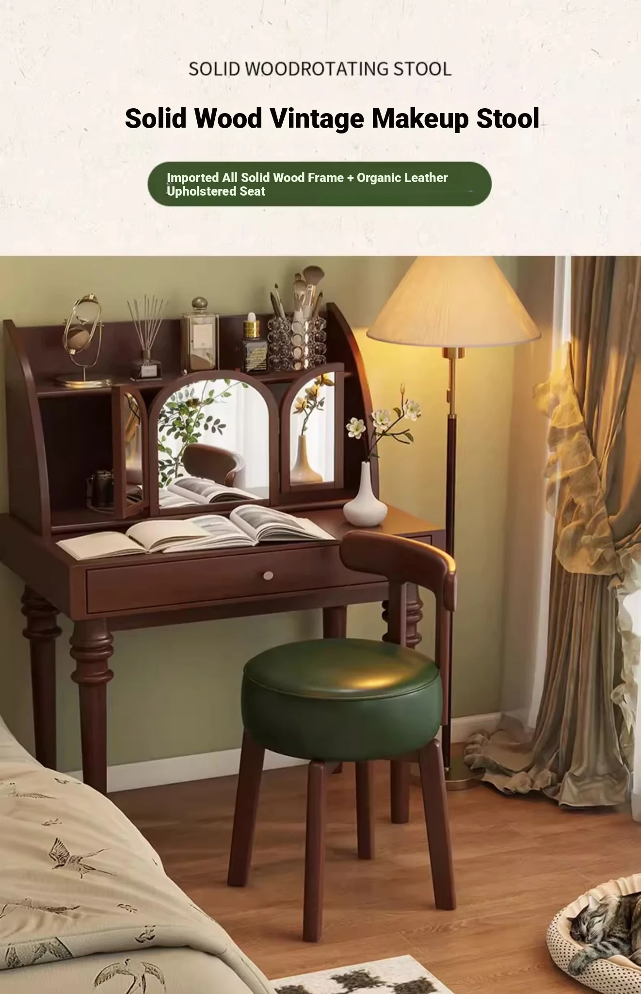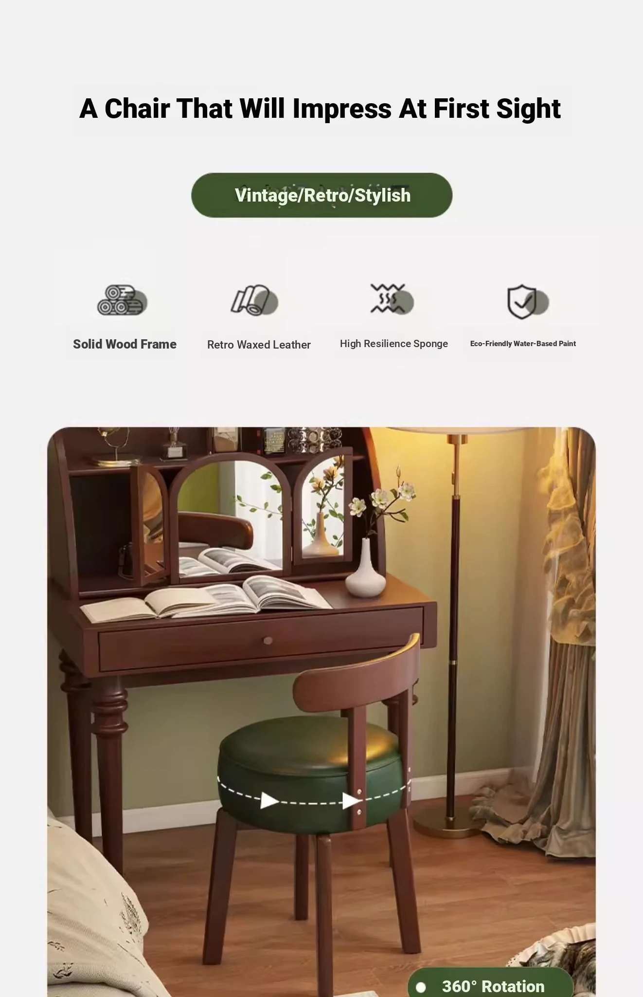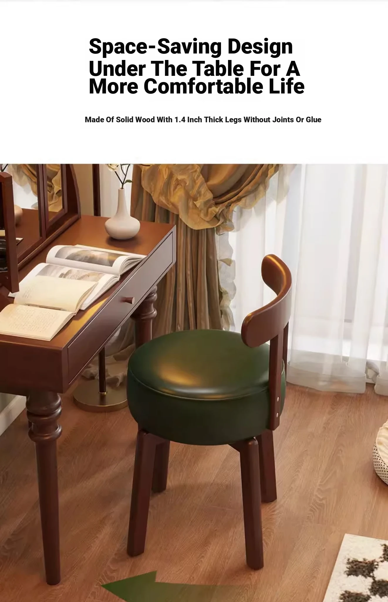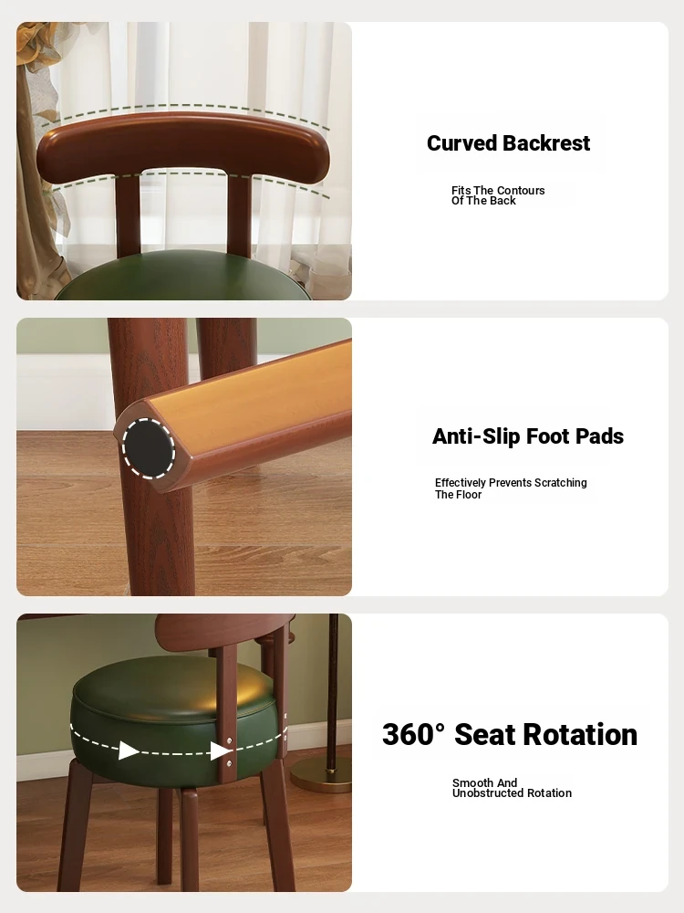 Vintage-Style Rotating Makeup Chair - Solid Wood Vanity Stool with Backrest for Girls' Bedrooms - Retro Elegance Meets Modern Luxury