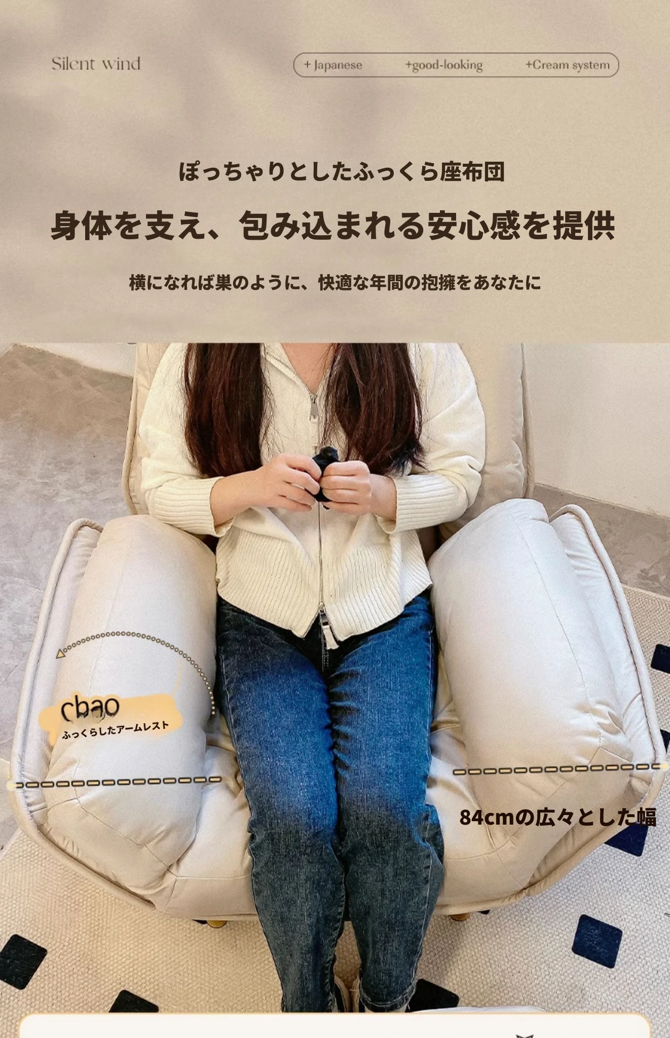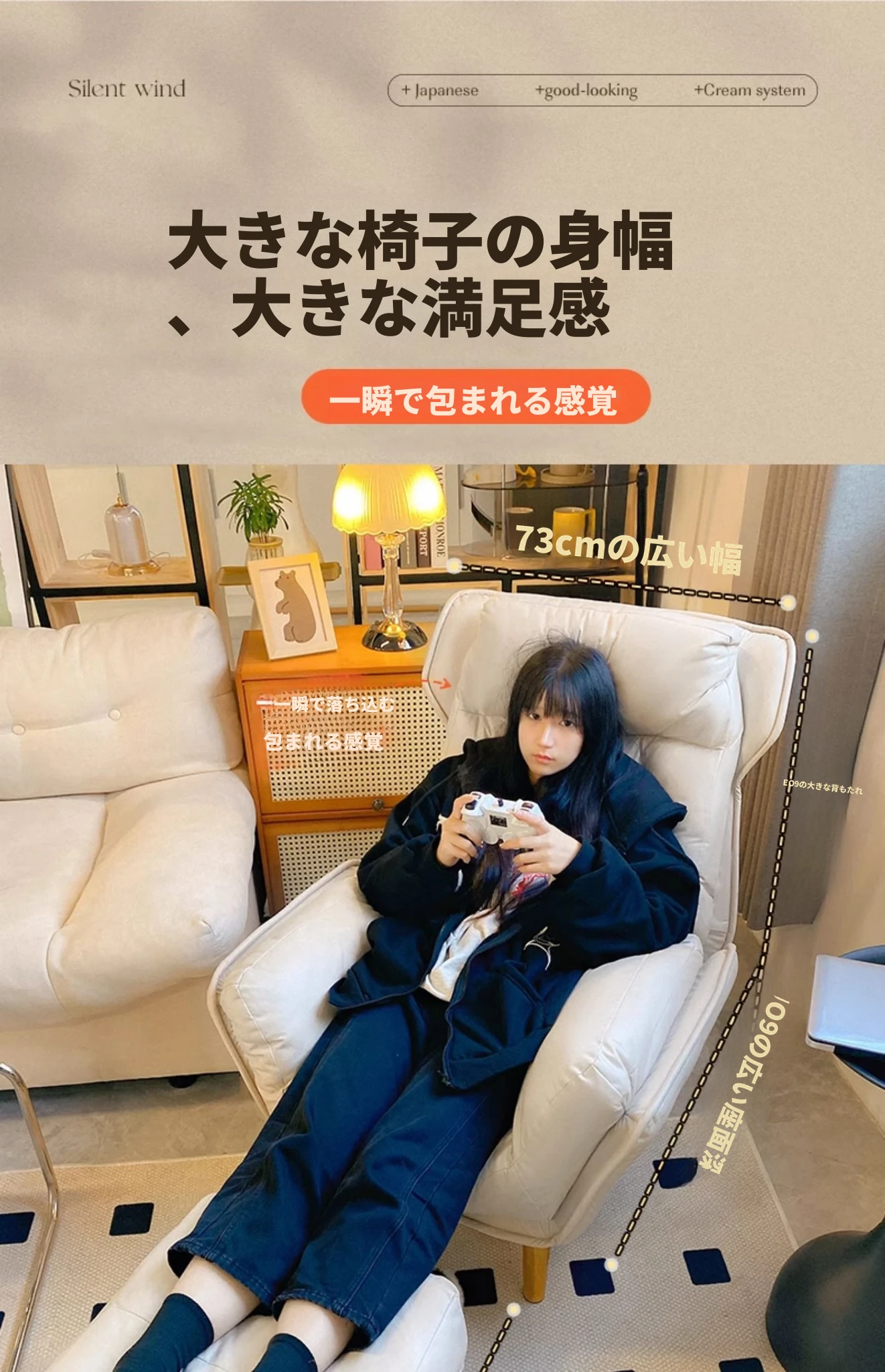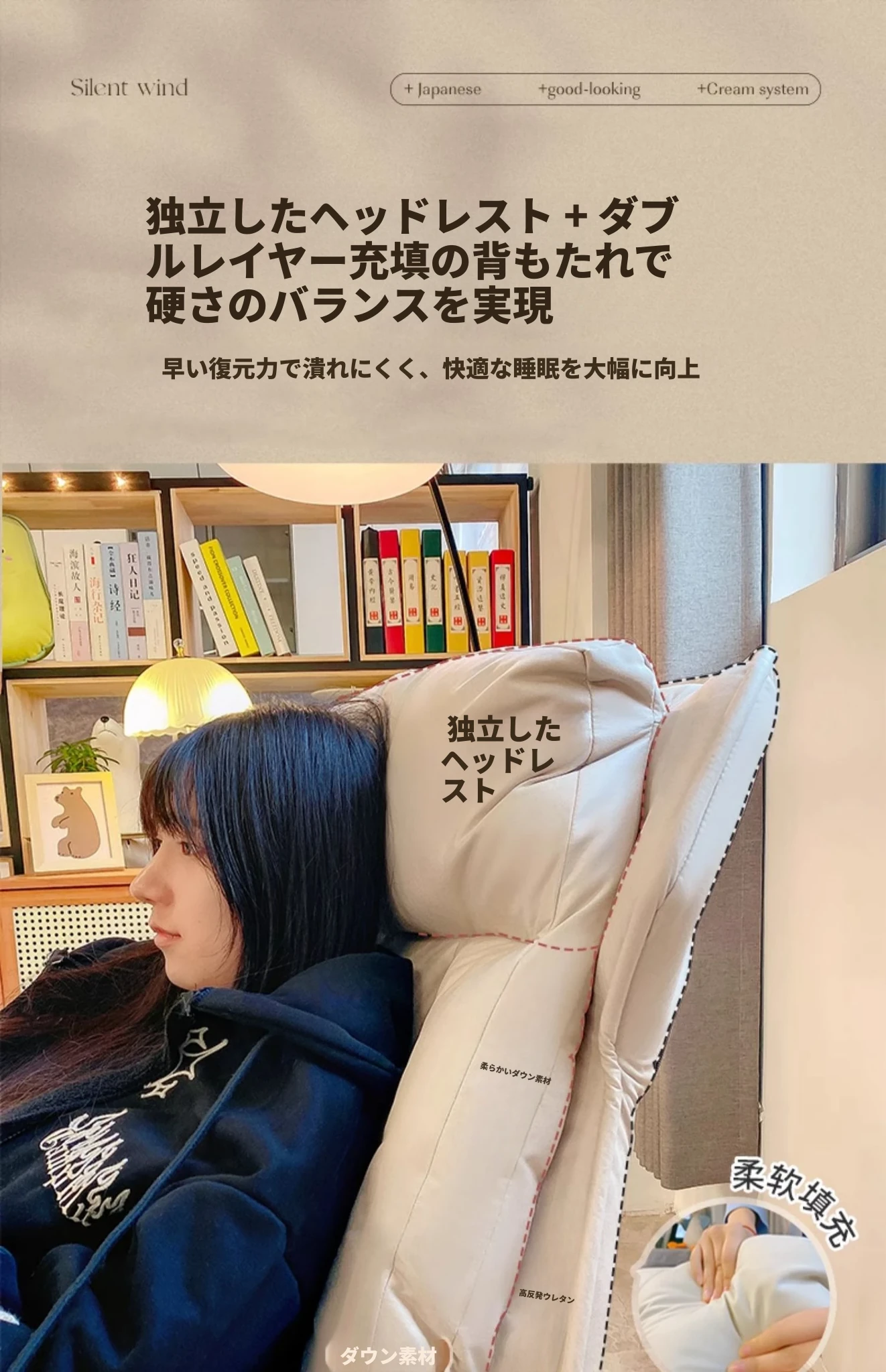 【ダブルレイヤー厚手】アイボリー + フットレスト付き—折りたたみリクライニングソファチェア