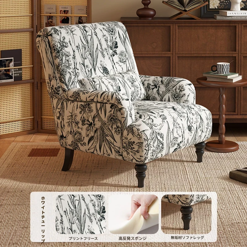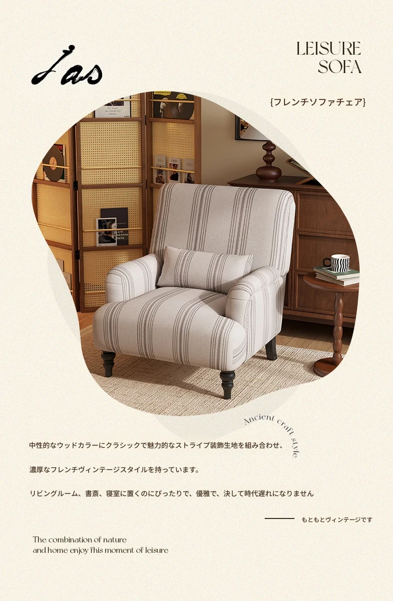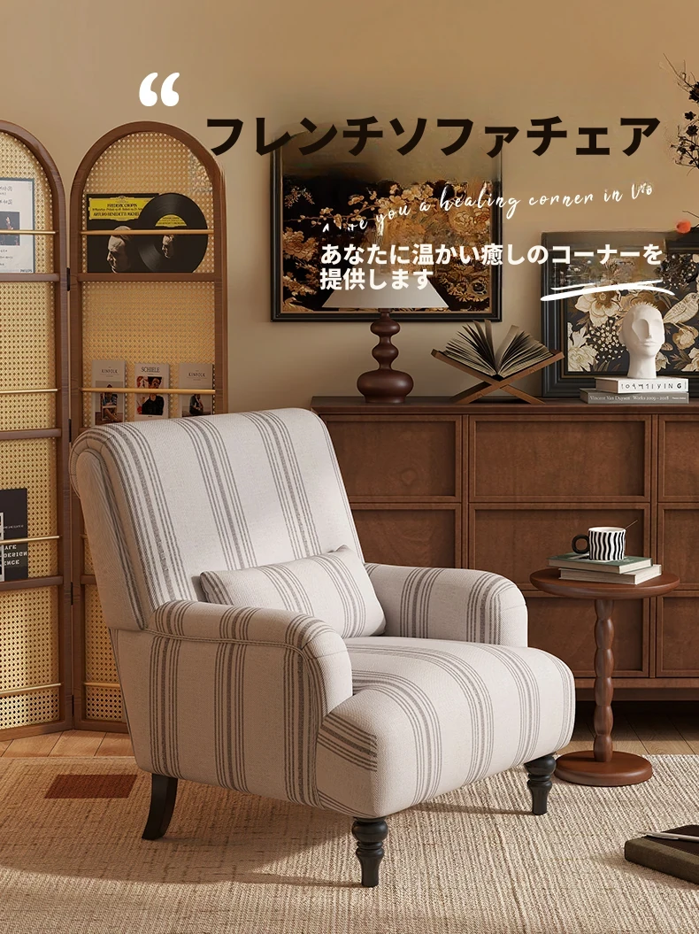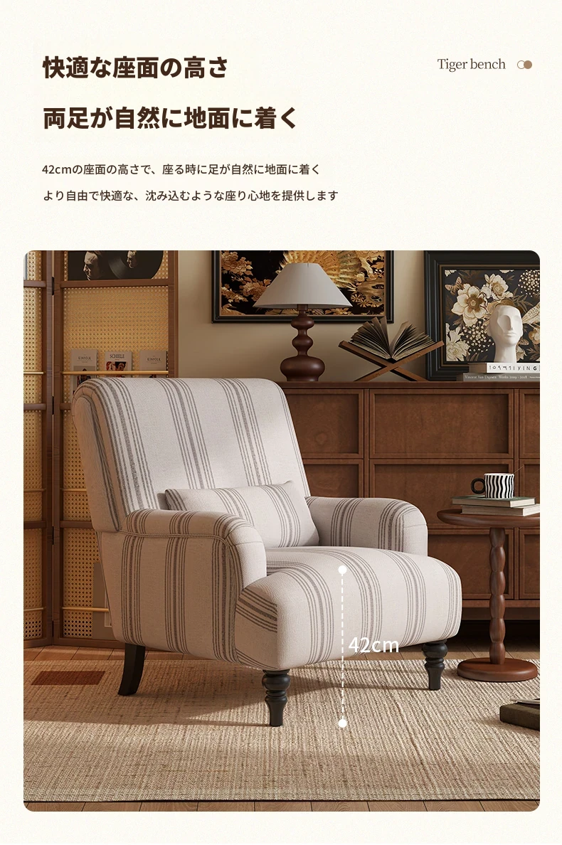 フレンチビンテージ一人掛けソファ、洗練されたデザインでリビングやバルコニー、寝室に最適。高級感あふれる虎柄で、くつろぎのひとときを演出するリラックスチェア。
