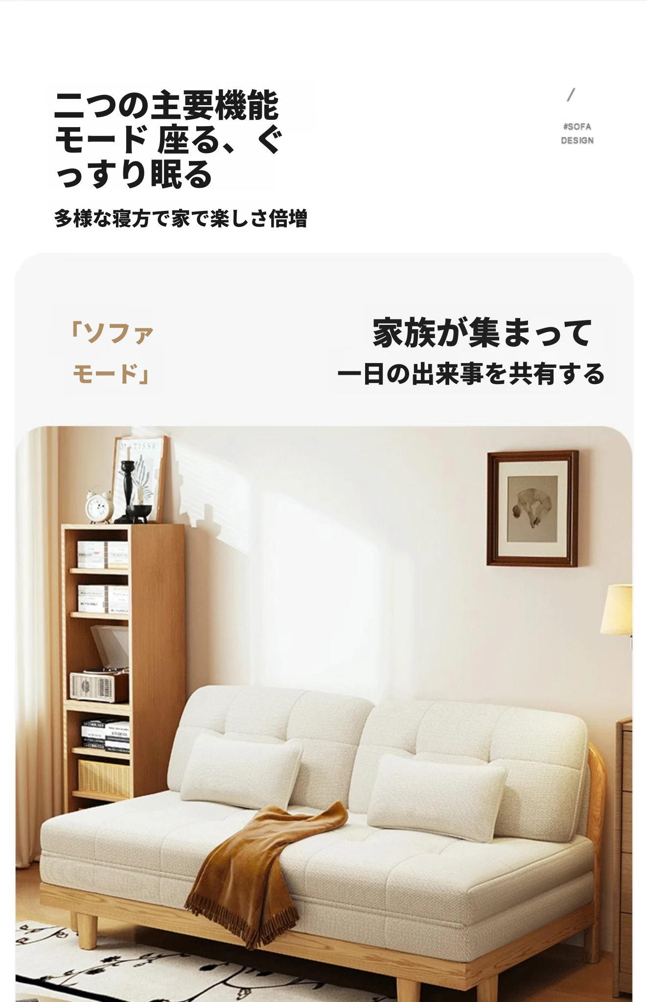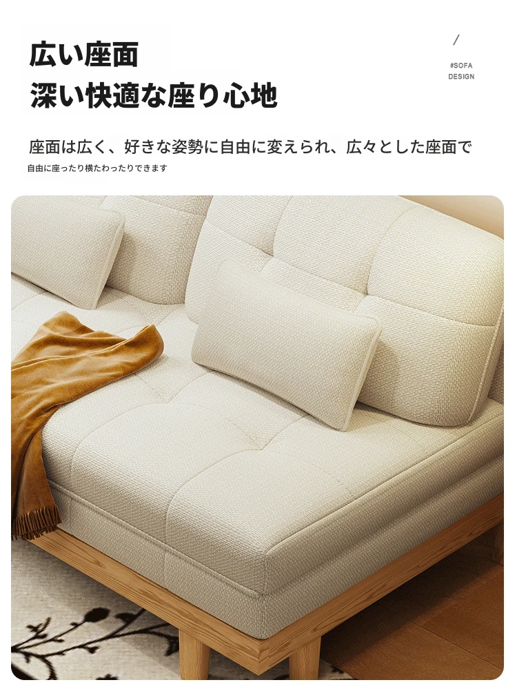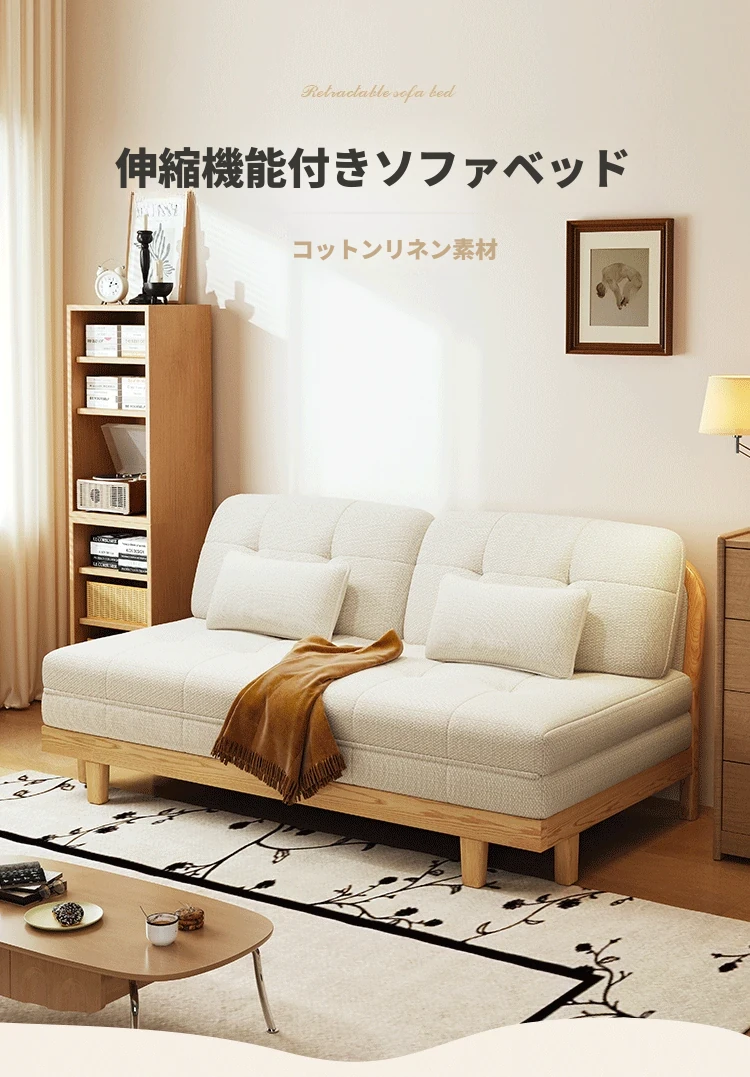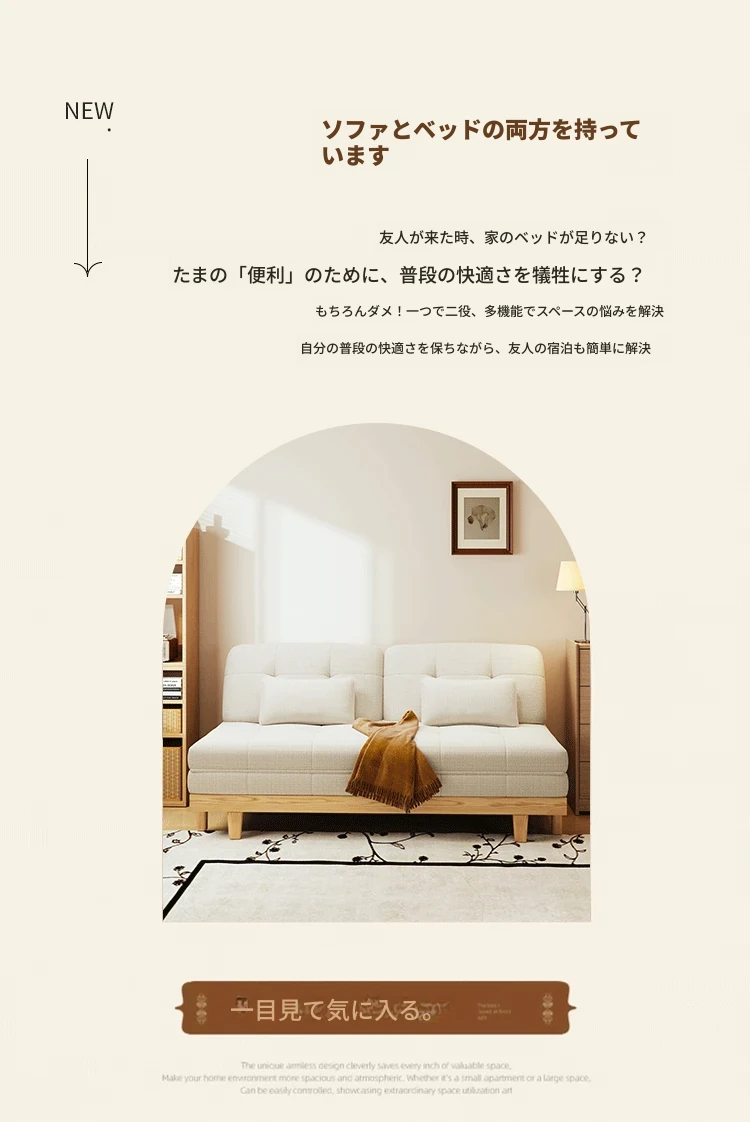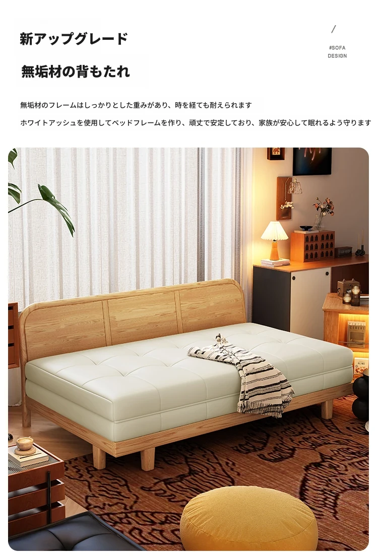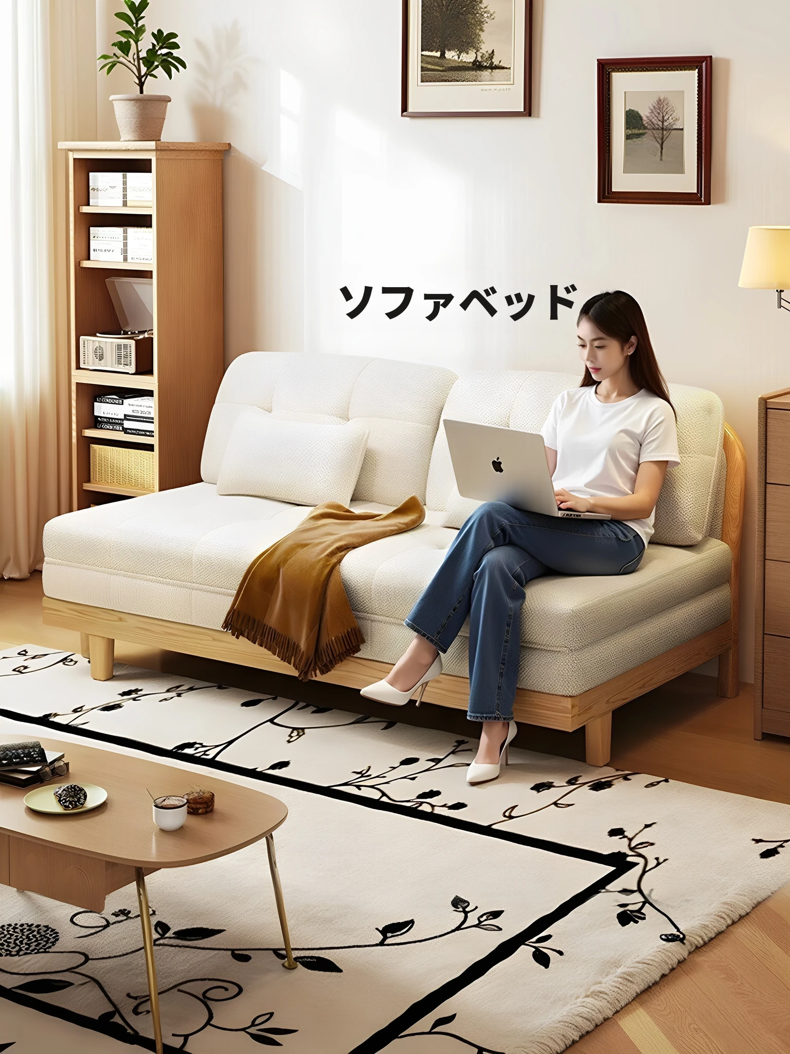 モダンでシンプルなクリームカラーの天然木製折りたたみソファベッド - 小さなバルコニーや書斎、寝室にぴったり!座ることも寝ることもできる多機能デザインで、空間を有効活用しながら快適さを提供します。