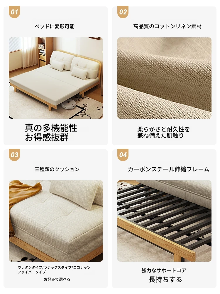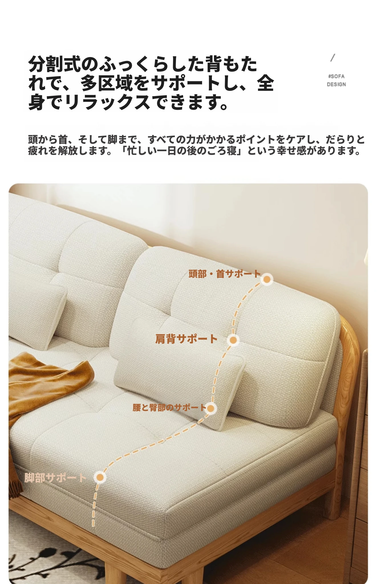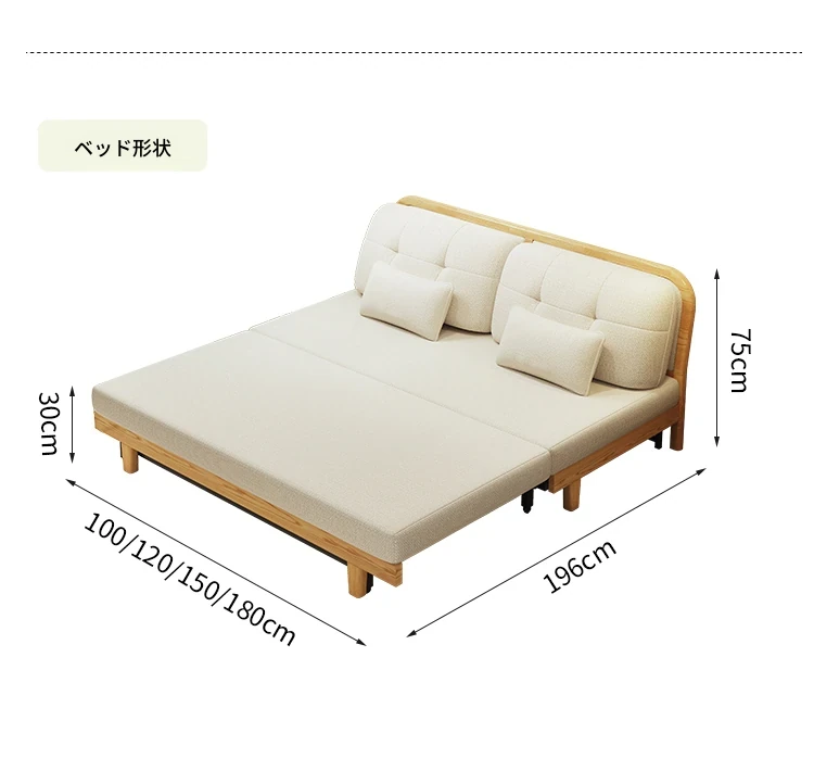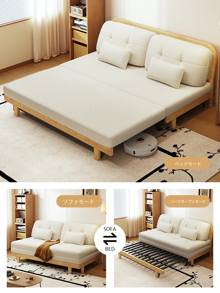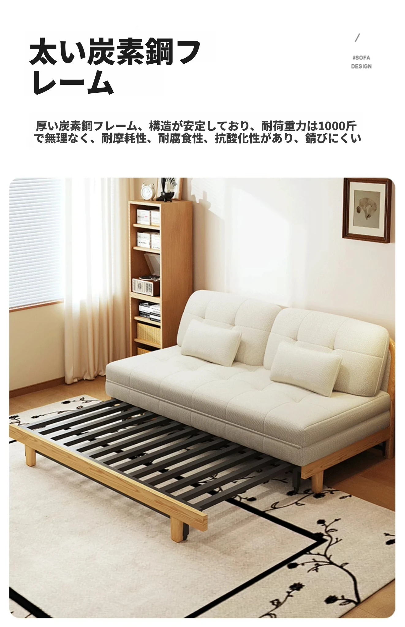 モダンでシンプルなクリームカラーの天然木製折りたたみソファベッド - 小さなバルコニーや書斎、寝室にぴったり!座ることも寝ることもできる多機能デザインで、空間を有効活用しながら快適さを提供します。