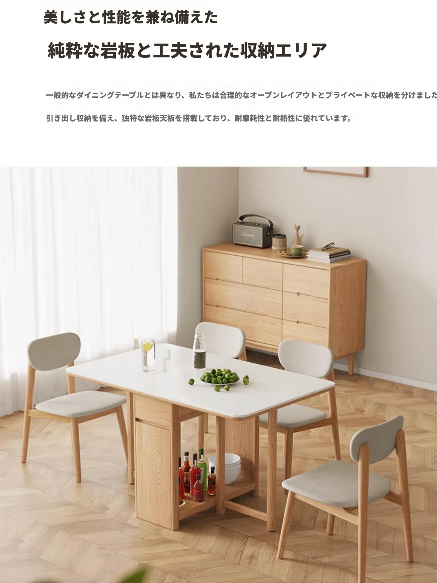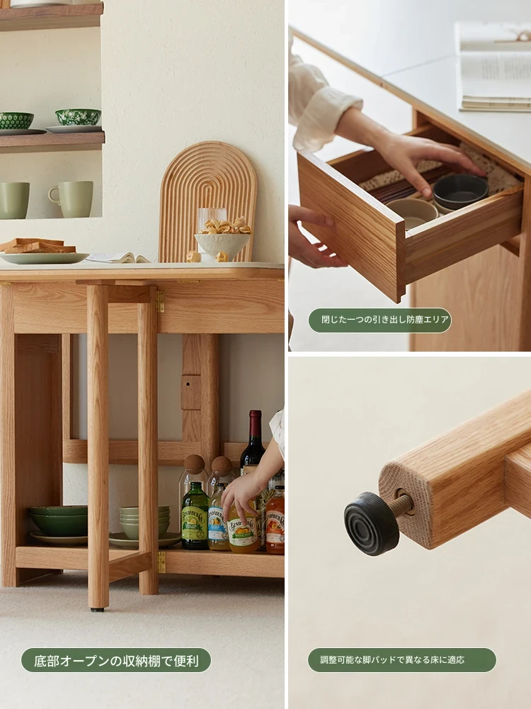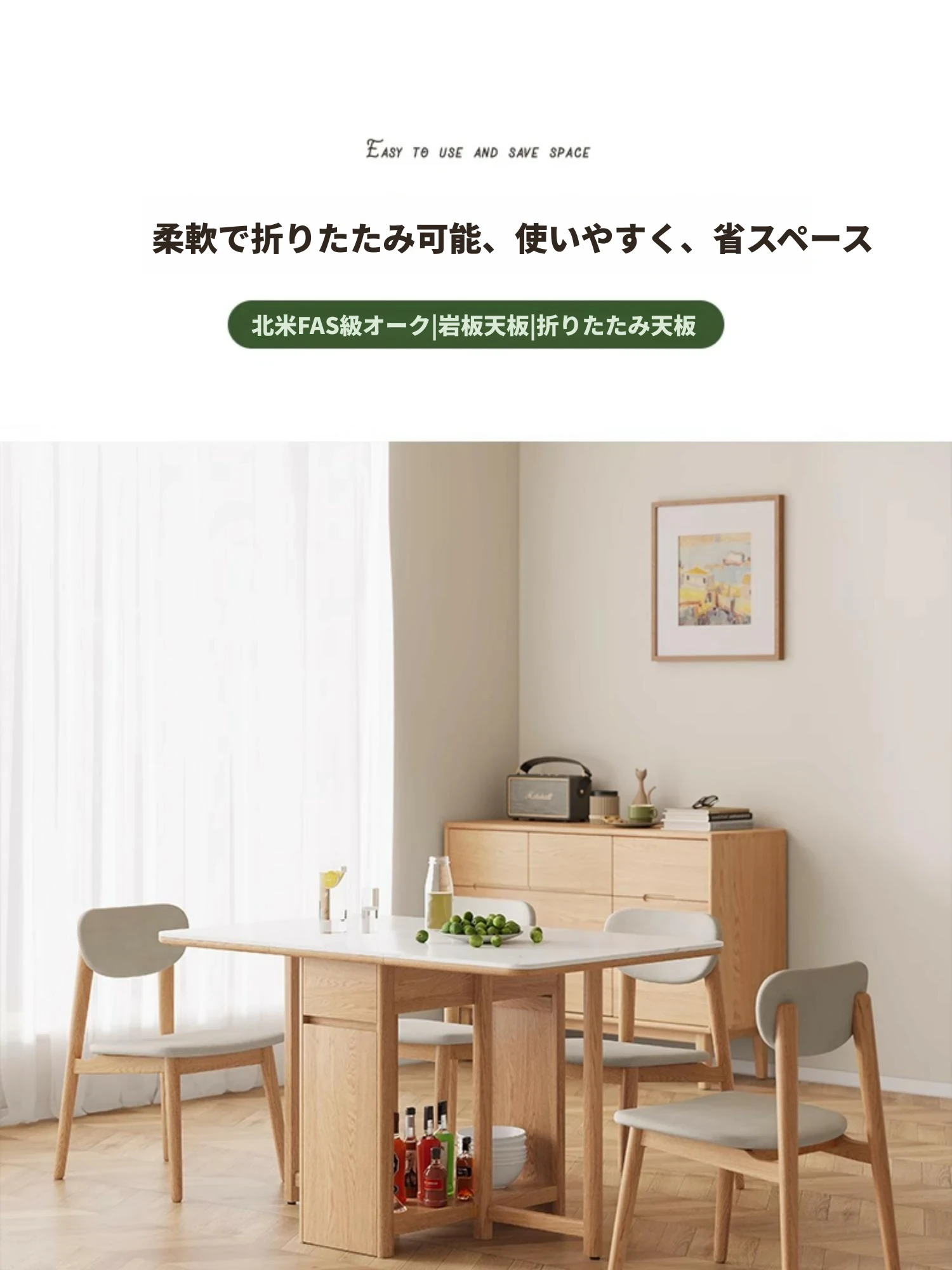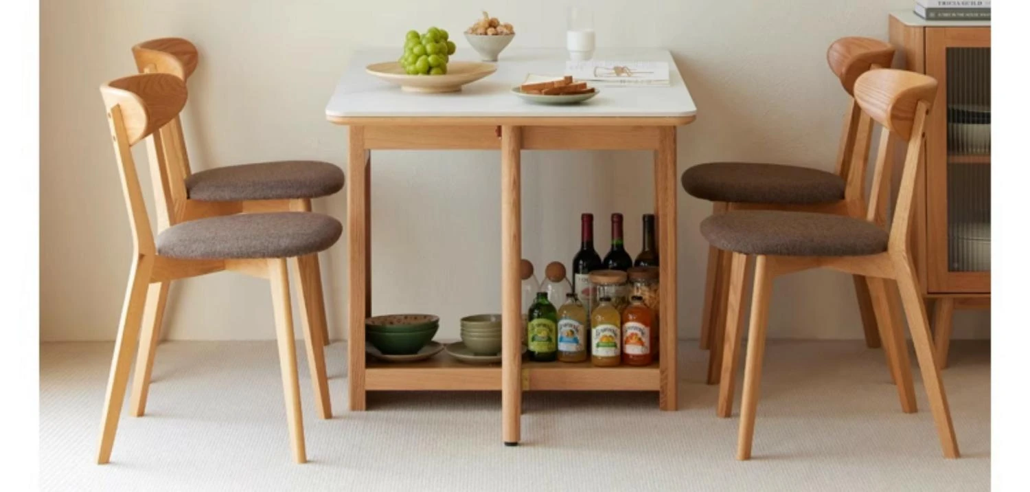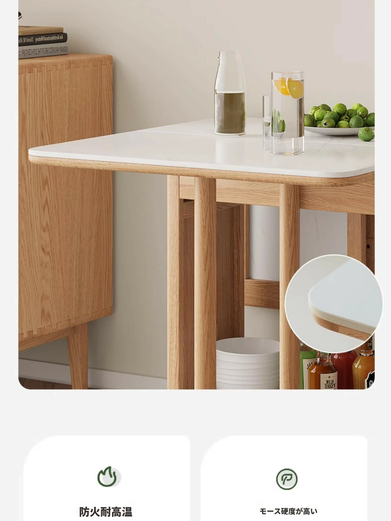 オーク色-オークの岩板ダイニングテーブル(折りたたみ)