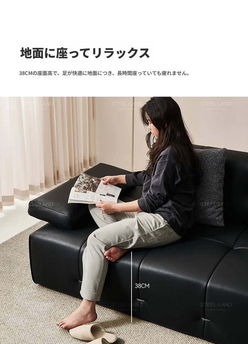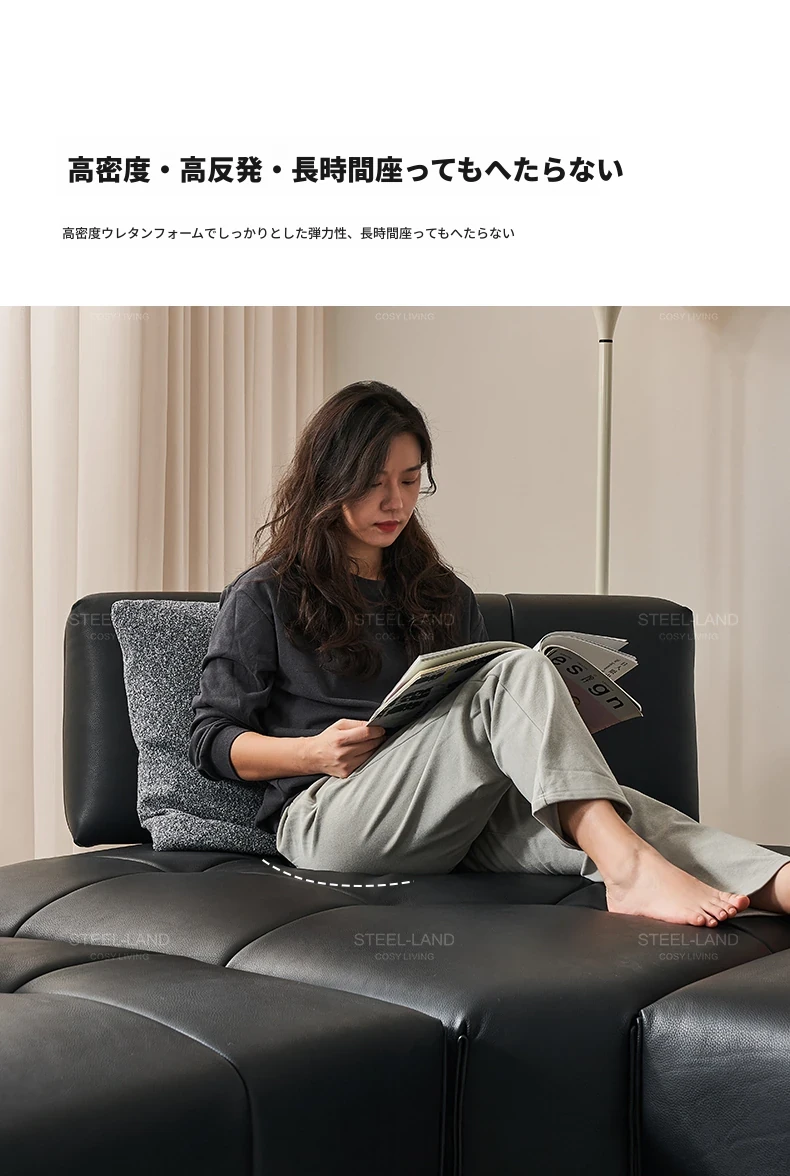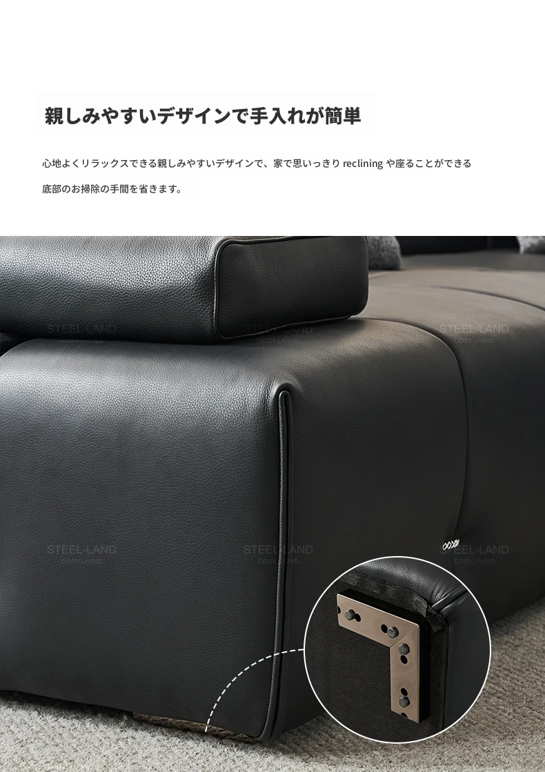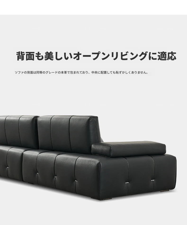 スティロラン本革ソファ・ローレンス|イタリアンミニマルデザインのブラックソファ、上質なトップグレインレザー使用で、洗練されたラグジュアリーな空間を演出します。