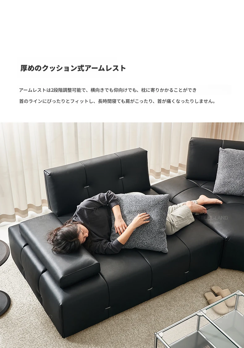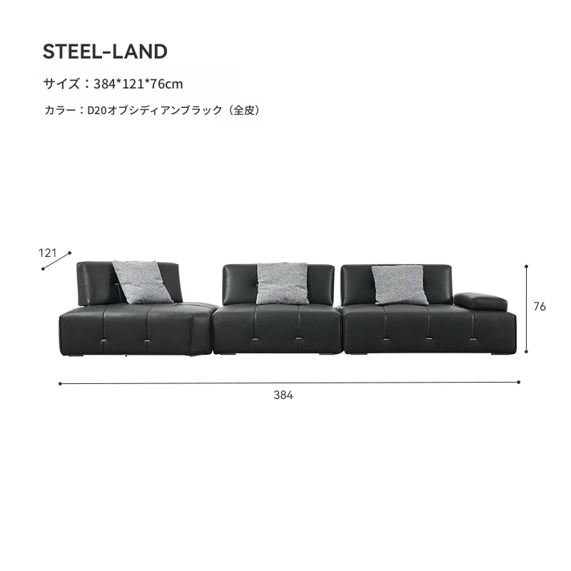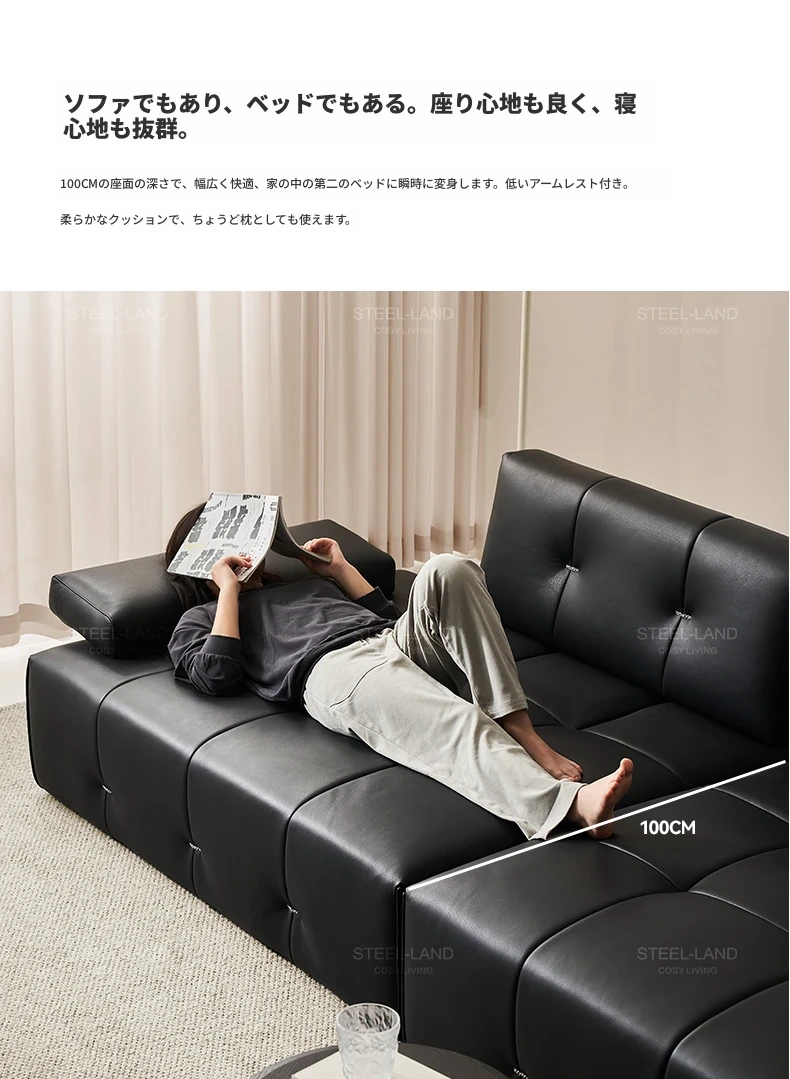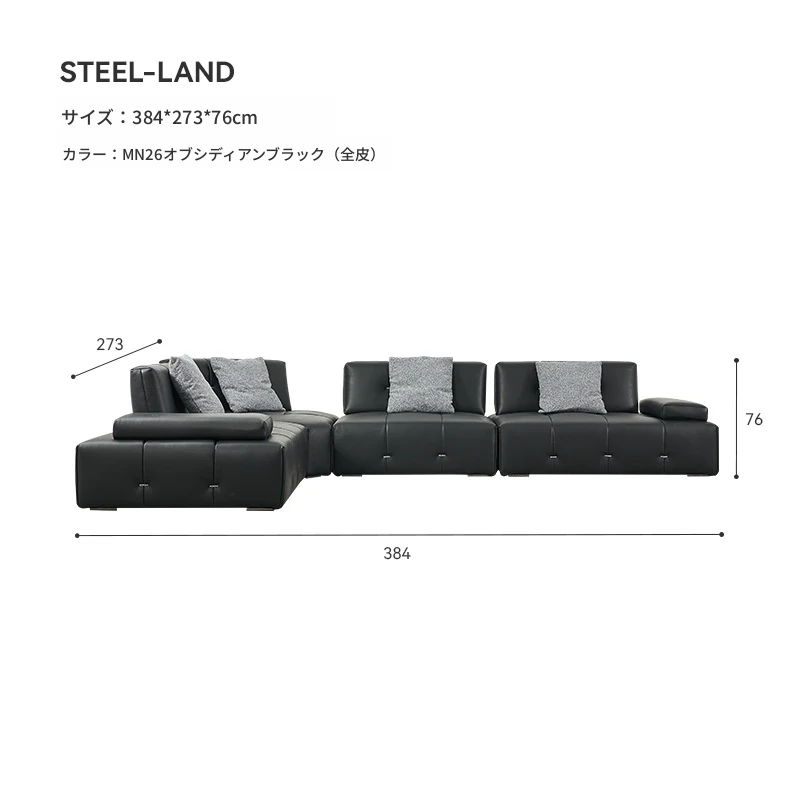 スティロラン本革ソファ・ローレンス|イタリアンミニマルデザインのブラックソファ、上質なトップグレインレザー使用で、洗練されたラグジュアリーな空間を演出します。