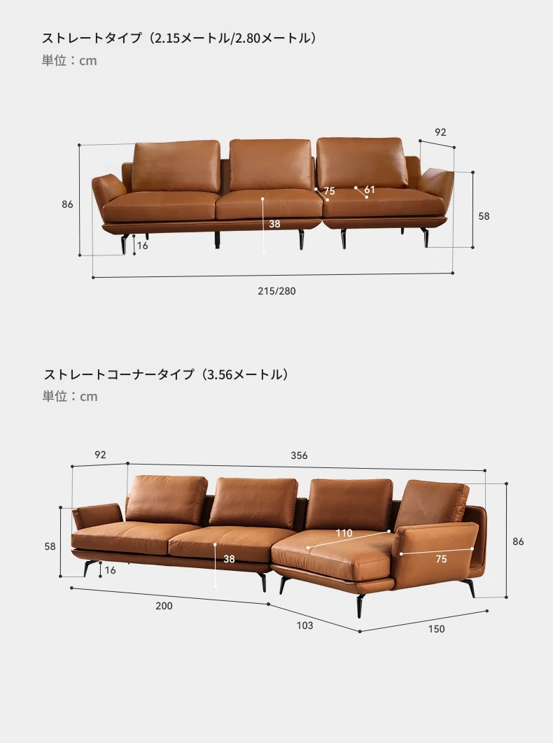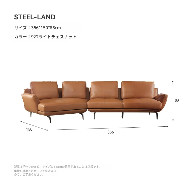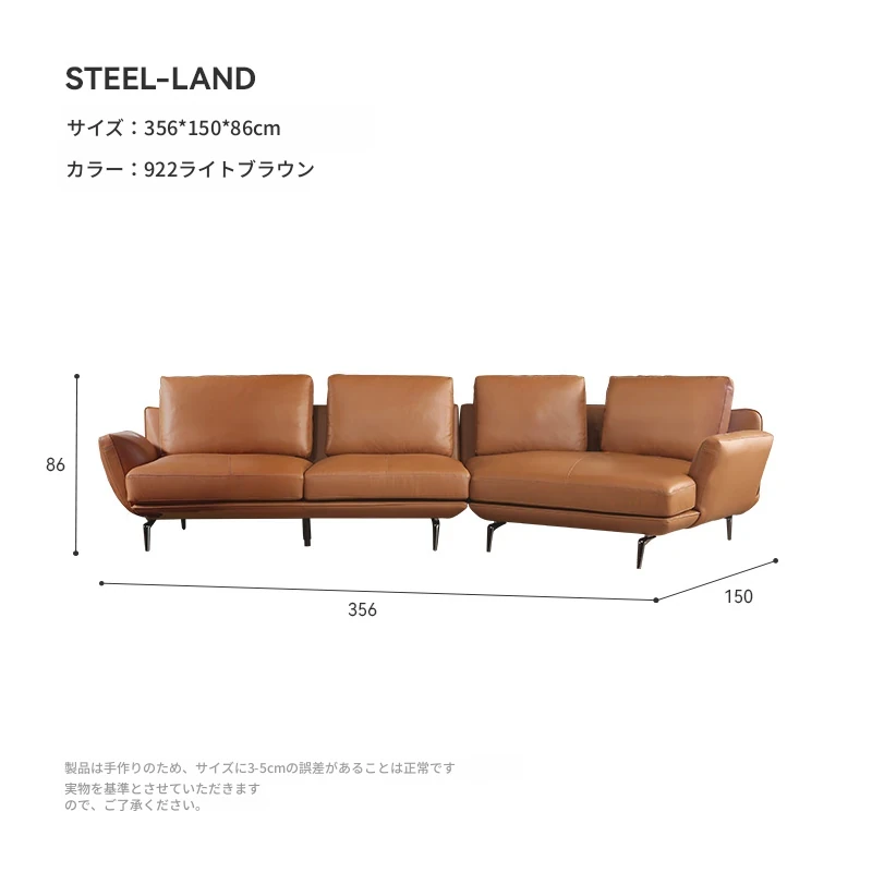 ①トップグレイン牛革 356cm 明るい栗色 ソファ左回転 半皮