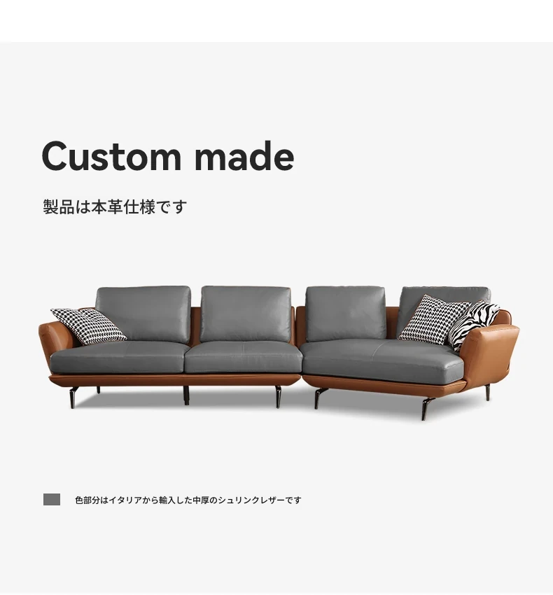 ④トップグレイン牛革 356cm 暖かい茶灰 ソファ右回転 半皮