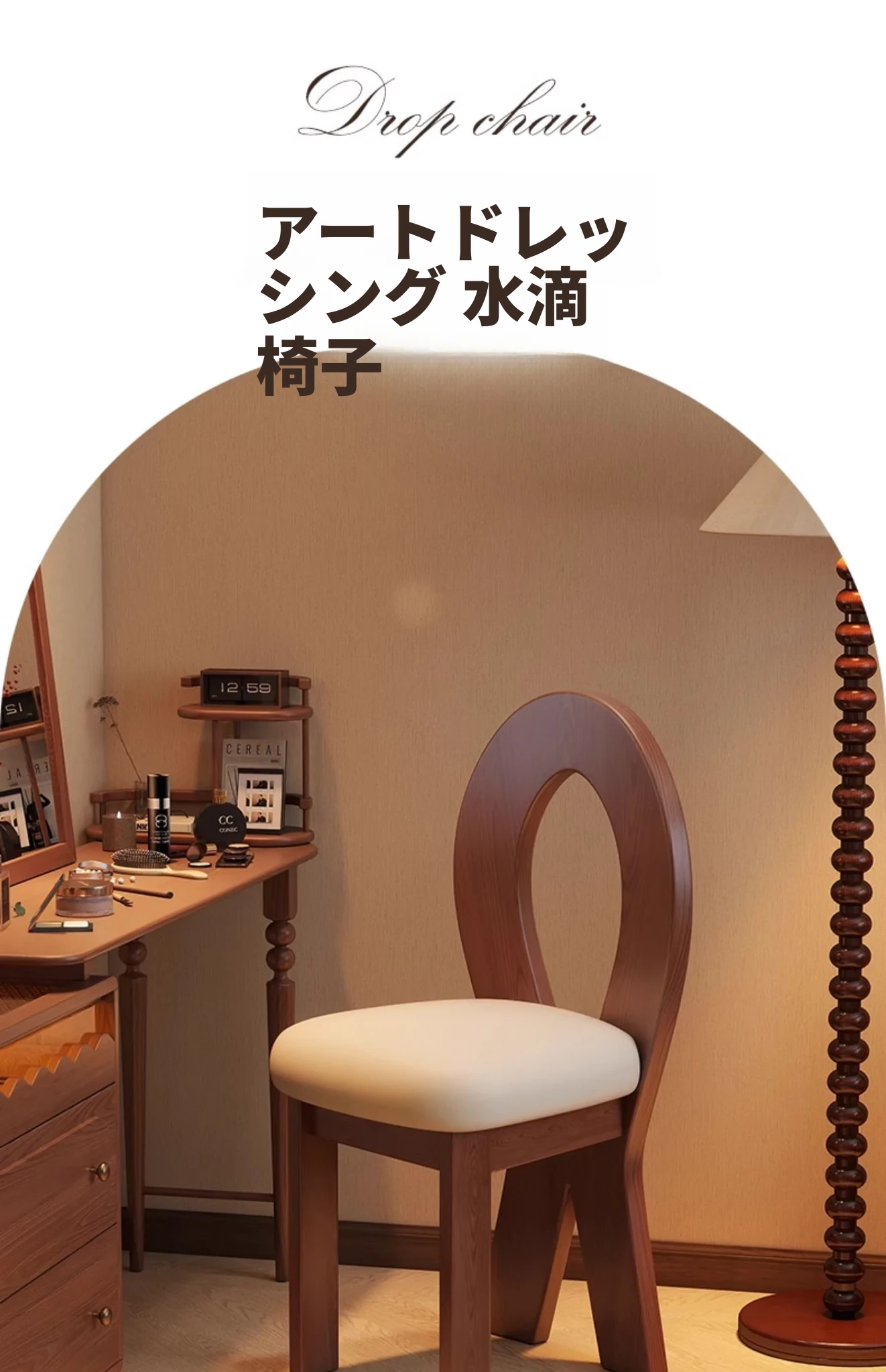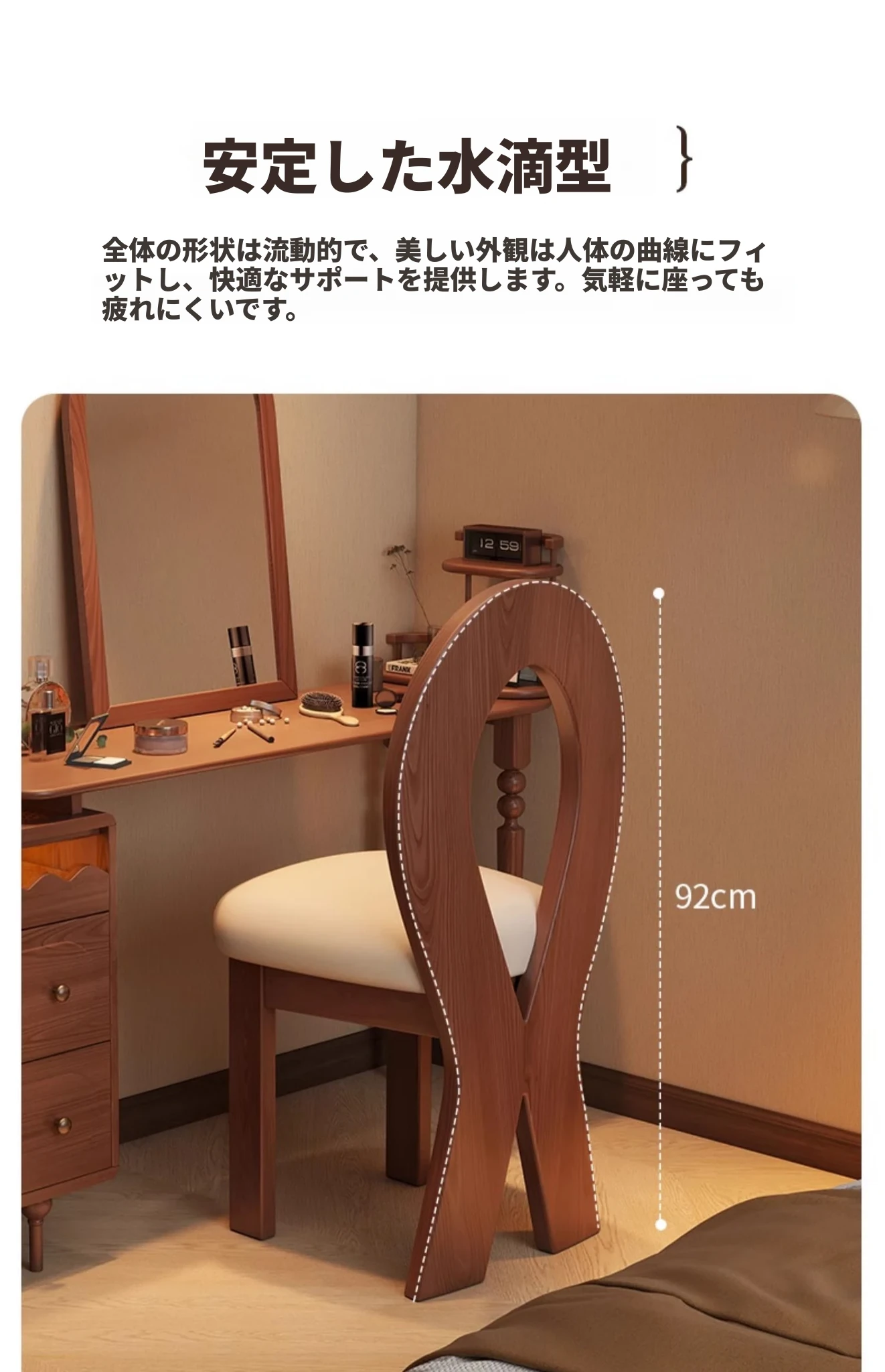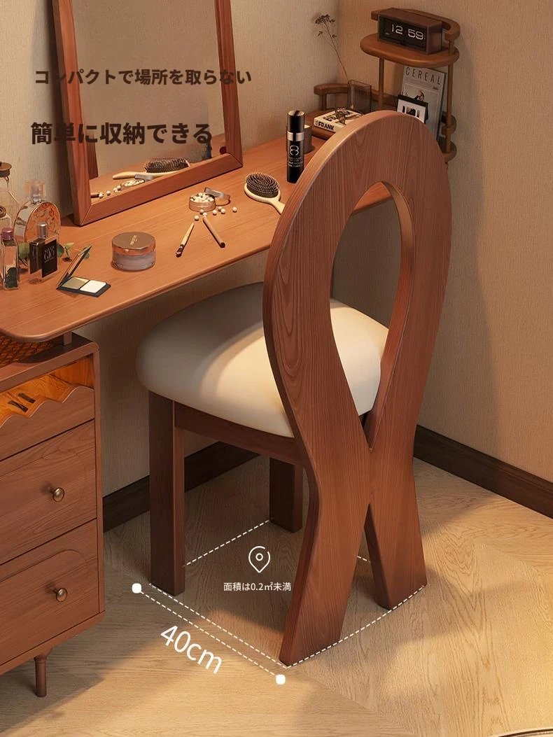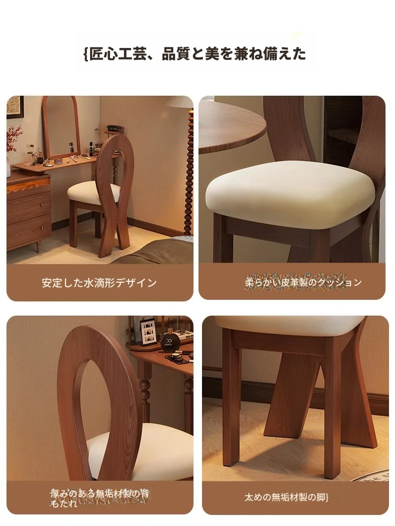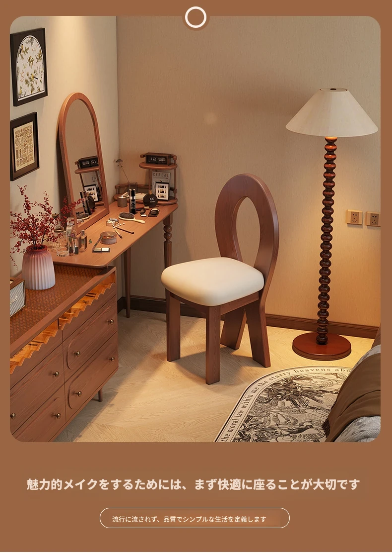 レトロな無垢材のドレッシングチェア - 古典的な侘び寂びスタイルの背もたれ付き椅子。寝室にぴったりな軽やかなラグジュアリー感を演出するフレンチスタイルのメイクアップスツール。おしゃれで機能的なアイテムをぜひ!