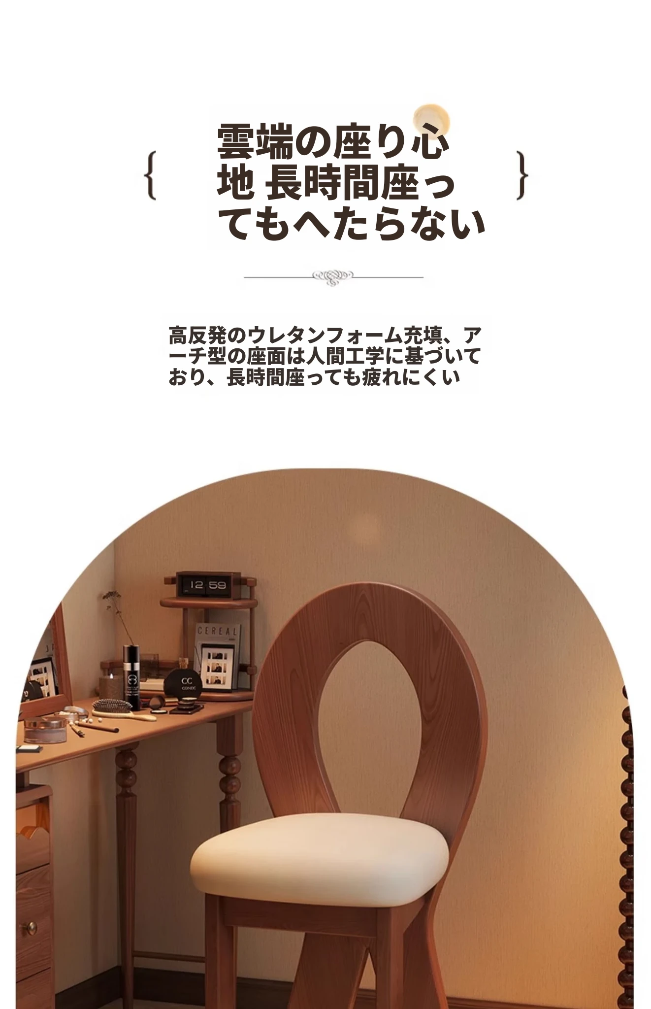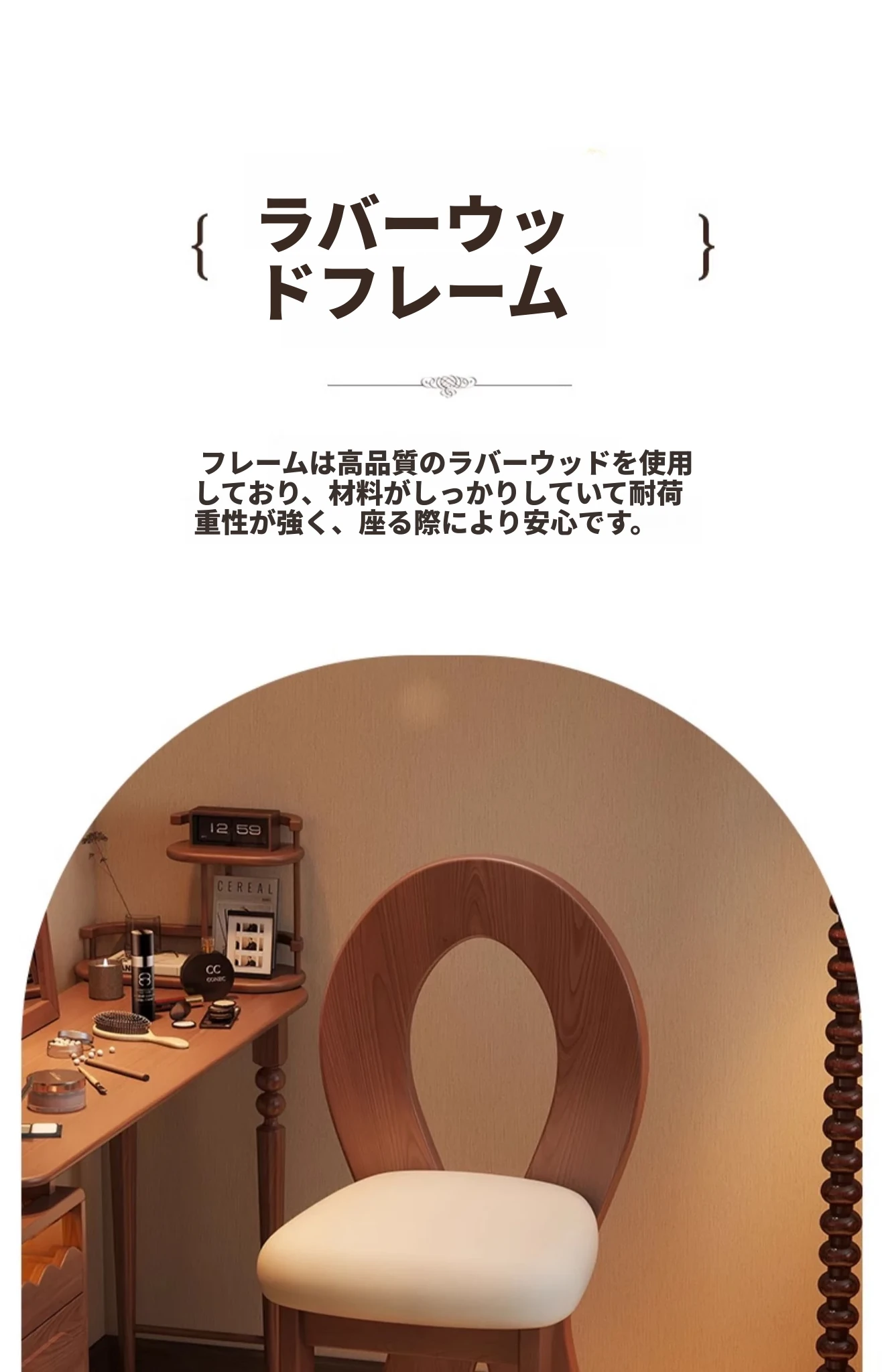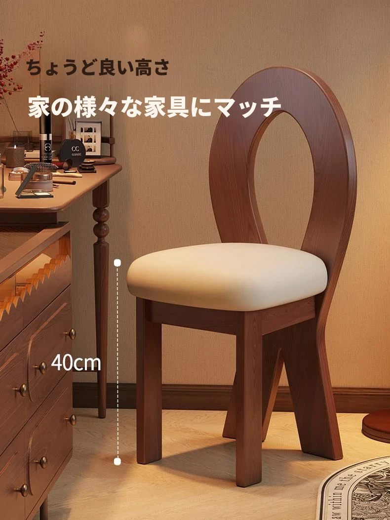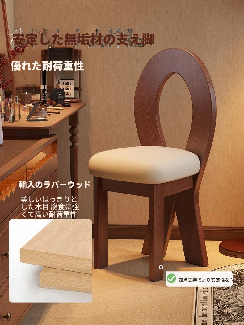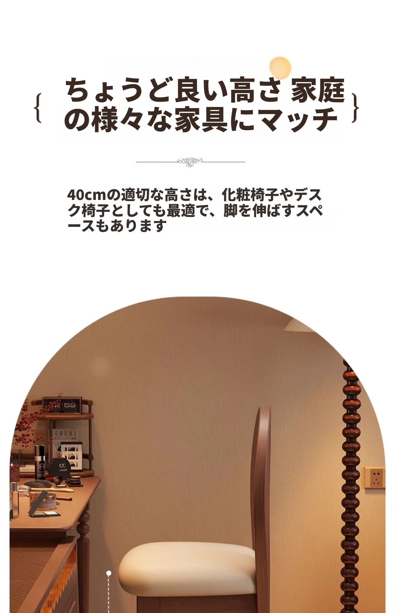 レトロな無垢材のドレッシングチェア - 古典的な侘び寂びスタイルの背もたれ付き椅子。寝室にぴったりな軽やかなラグジュアリー感を演出するフレンチスタイルのメイクアップスツール。おしゃれで機能的なアイテムをぜひ!