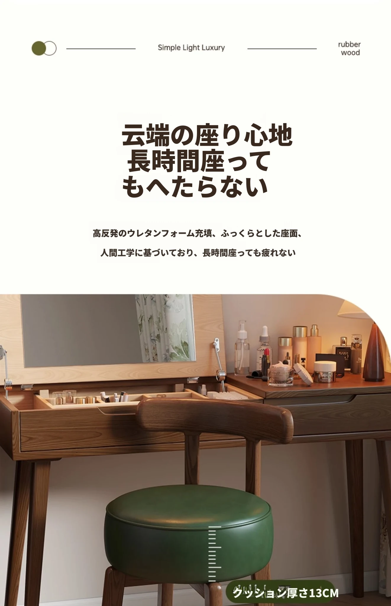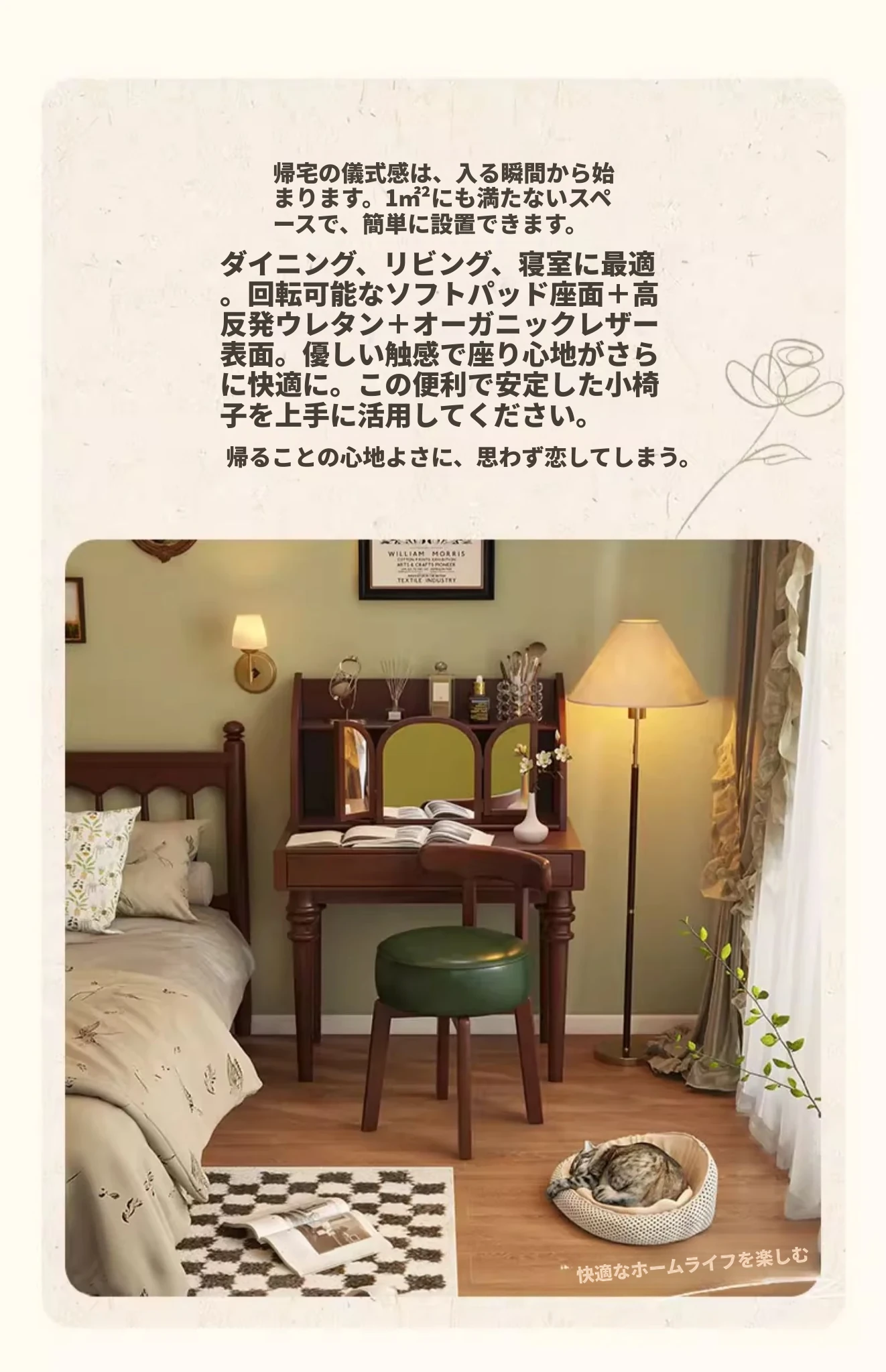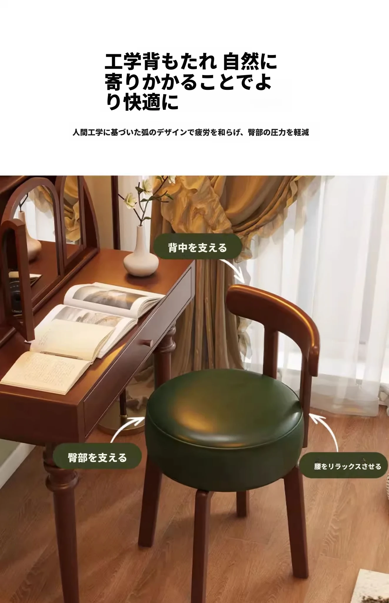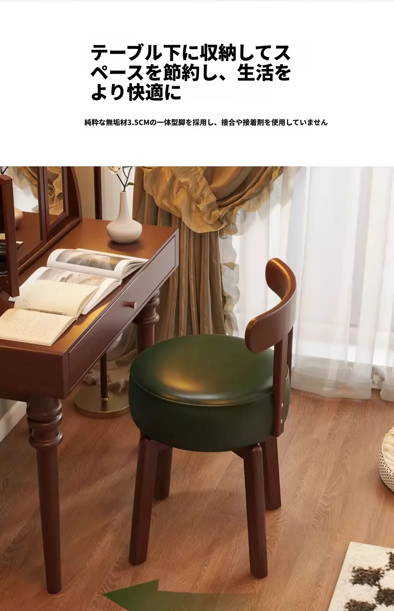 ヴィンテージ風回転式ドレッシングチェア|実木製|女の子のための寝室にぴったりな背もたれ付きドレッシングチェア|レトロで洗練されたデザイン|軽やかな贅沢感を演出!