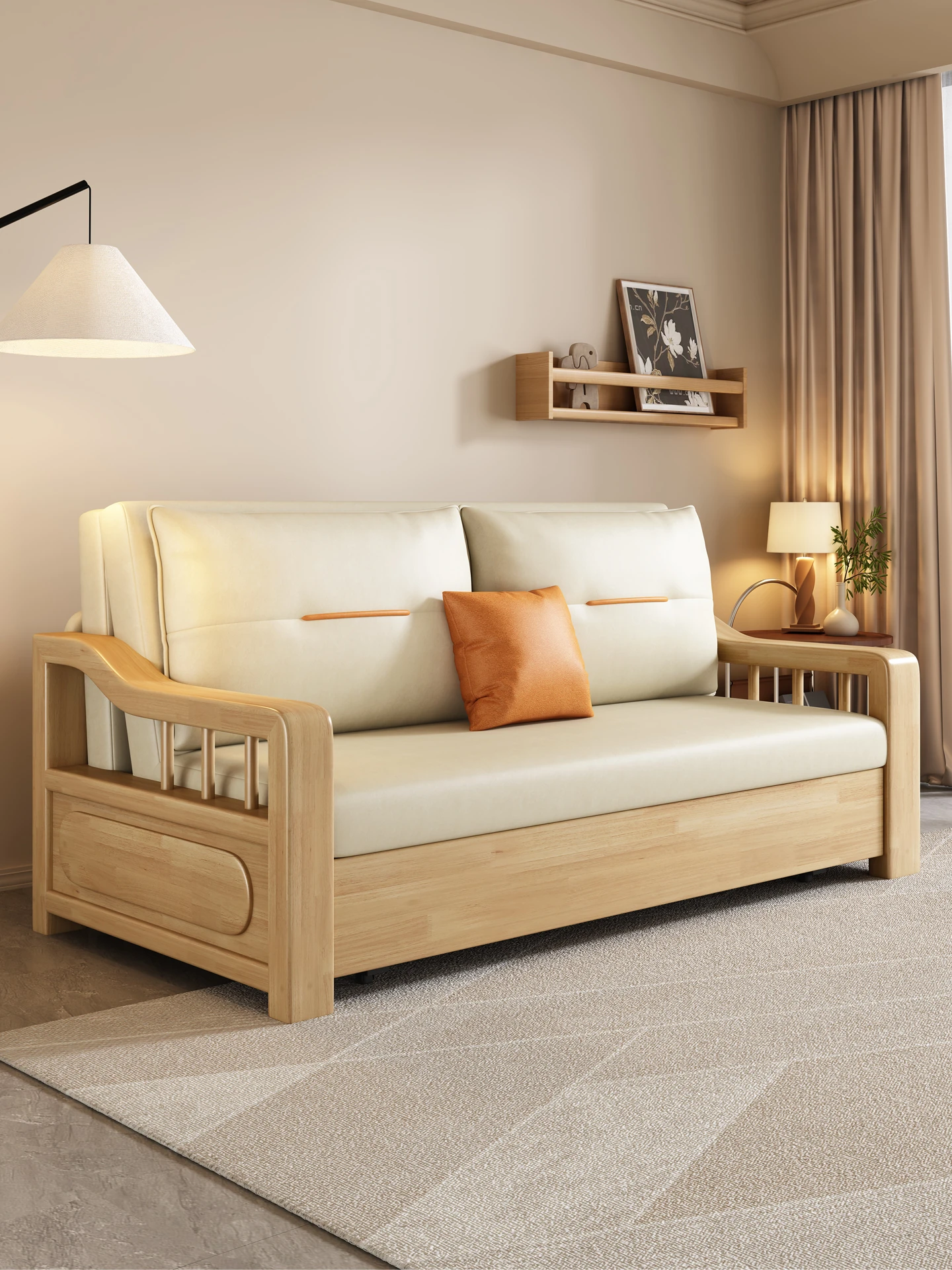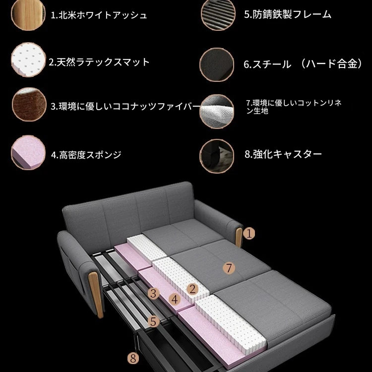 【香港送料無料】省スペース!リビングにぴったりの折りたたみソファベッド - 拡張可能な無垢材製プルアウトベッドで、座る・寝るの多機能を実現!