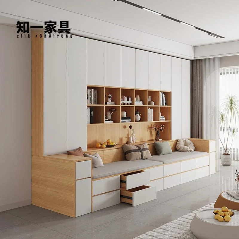 香港送料無料!多機能ソファ&書棚一体型リビング用壁面キャビネット。カラフルなデザインで、収納力抜群!家庭用で便利なカウンタースペース付き、直送でお届けします。
