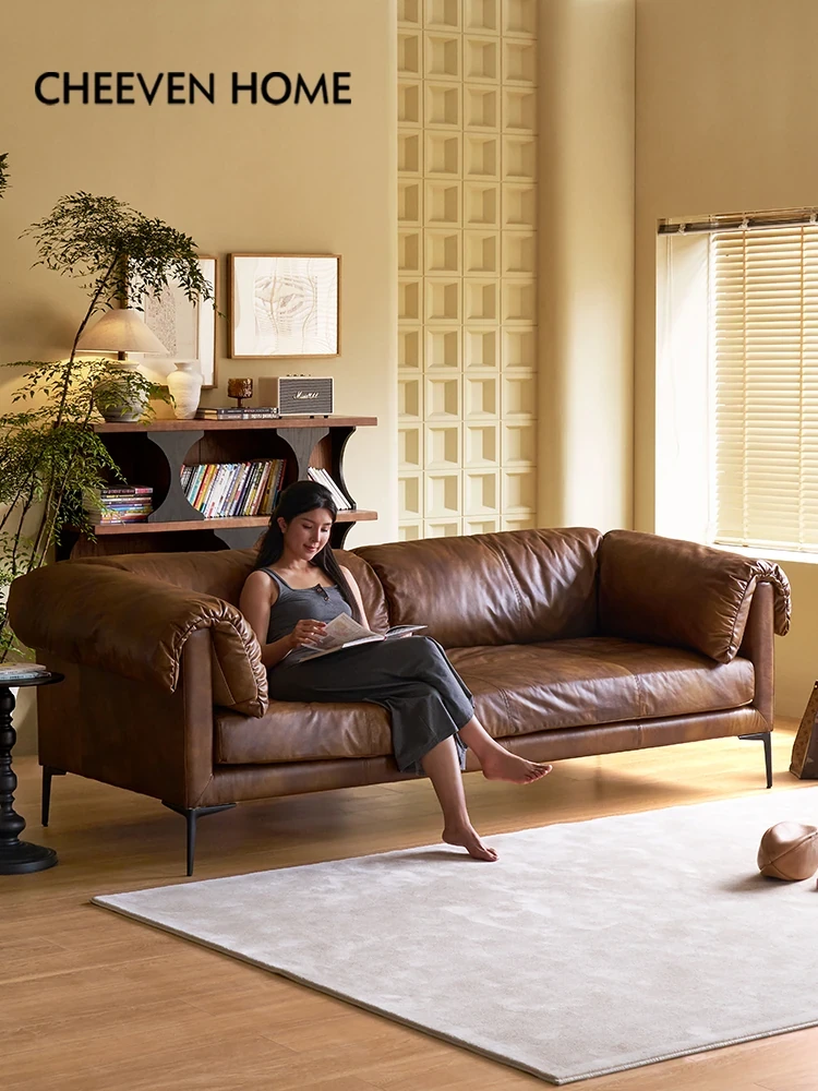 Premium American Vintage Top-Grain Leather Sofa - Designer Three-Seater for High-End Living Rooms, Featuring Full Aniline Leather for Ultimate Comfort and Style