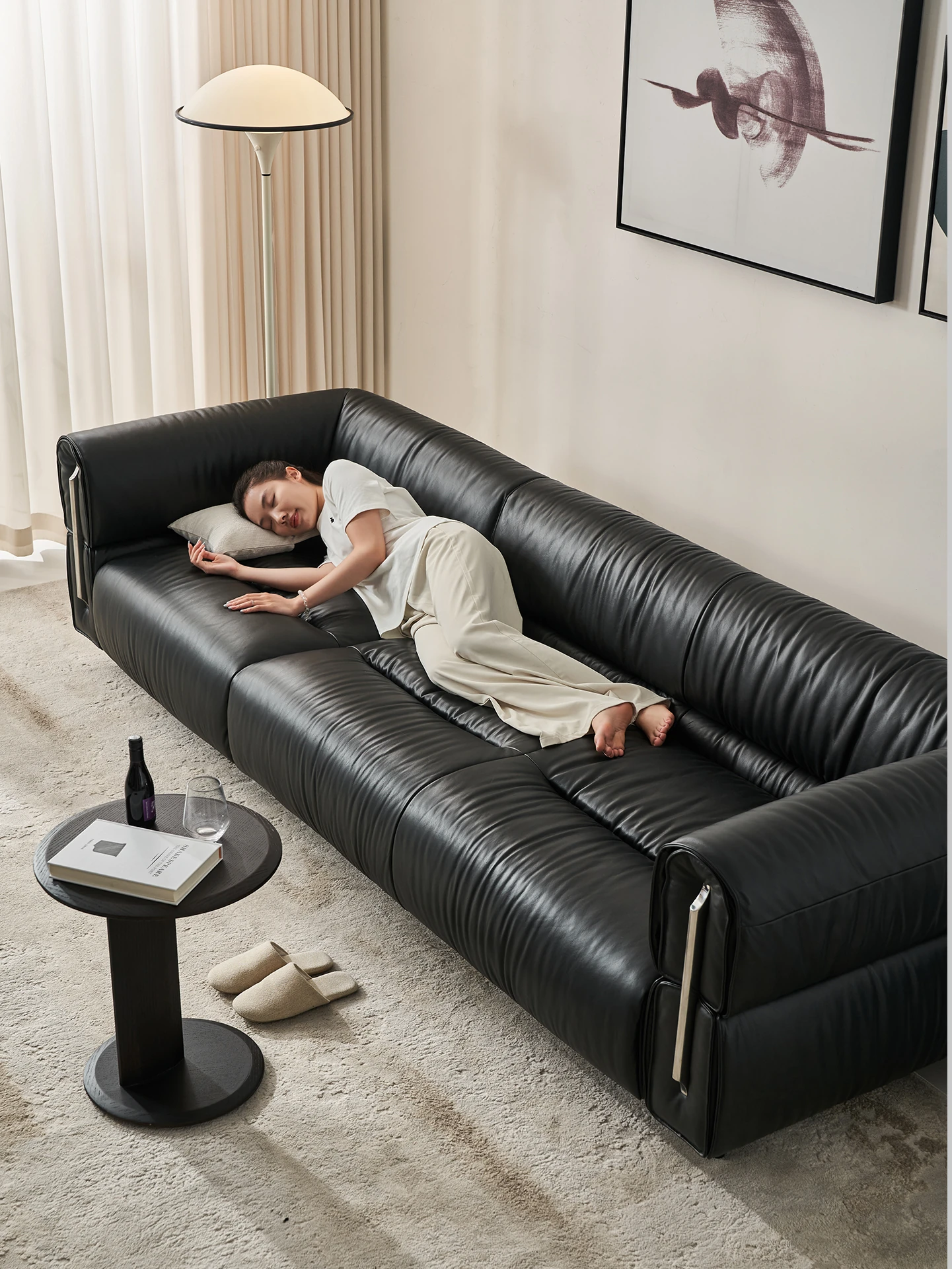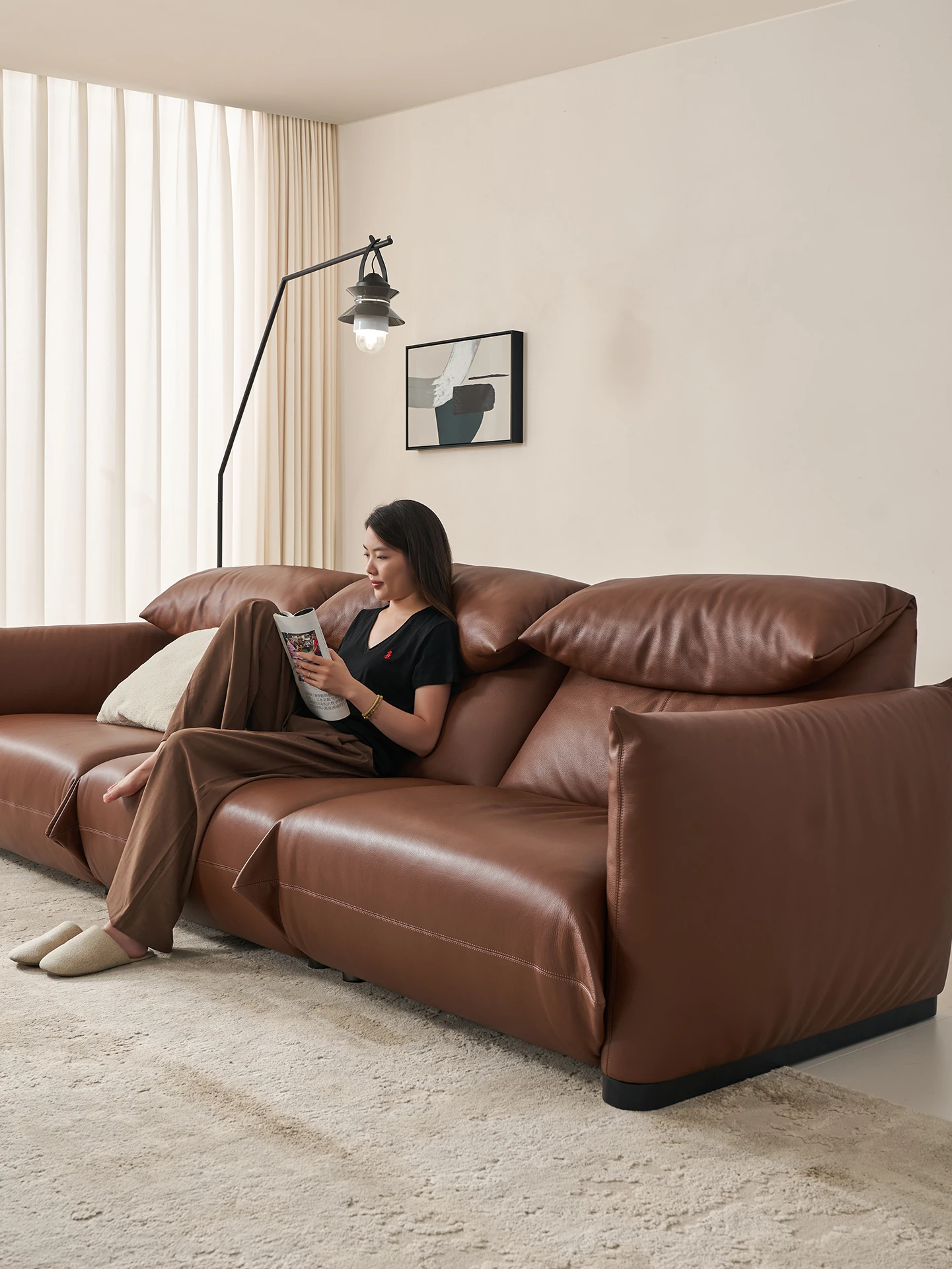 Stylish Italian Minimalist Leather Sofa - Luxurious Curved Design with Premium Down Filling for a Chic Living Room