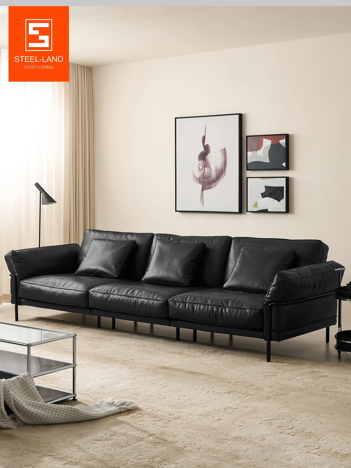 Steyrland Genuine Leather Black Sofa - Italian Minimalist Luxury for Small Living Rooms, Crafted from Top-Grade Cowhide