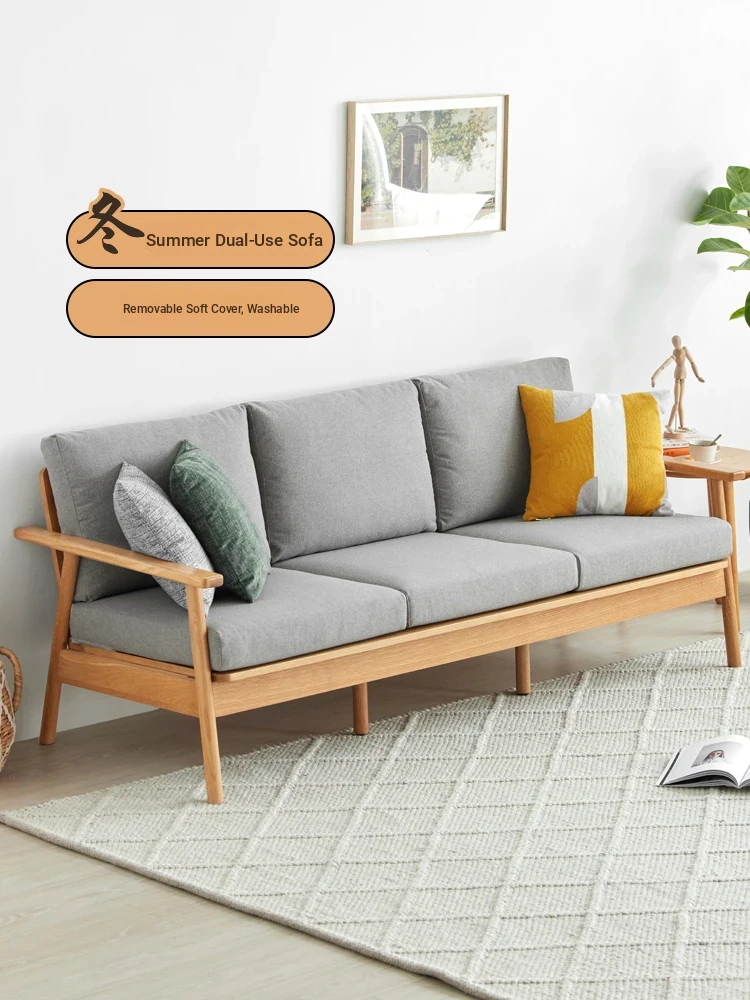 Scandinavian Solid Wood Sofa - Modern Minimalist 3-Seater for Small Spaces, Versatile Winter & Summer Design with Upholstered Fabric and Natural Wood Finish