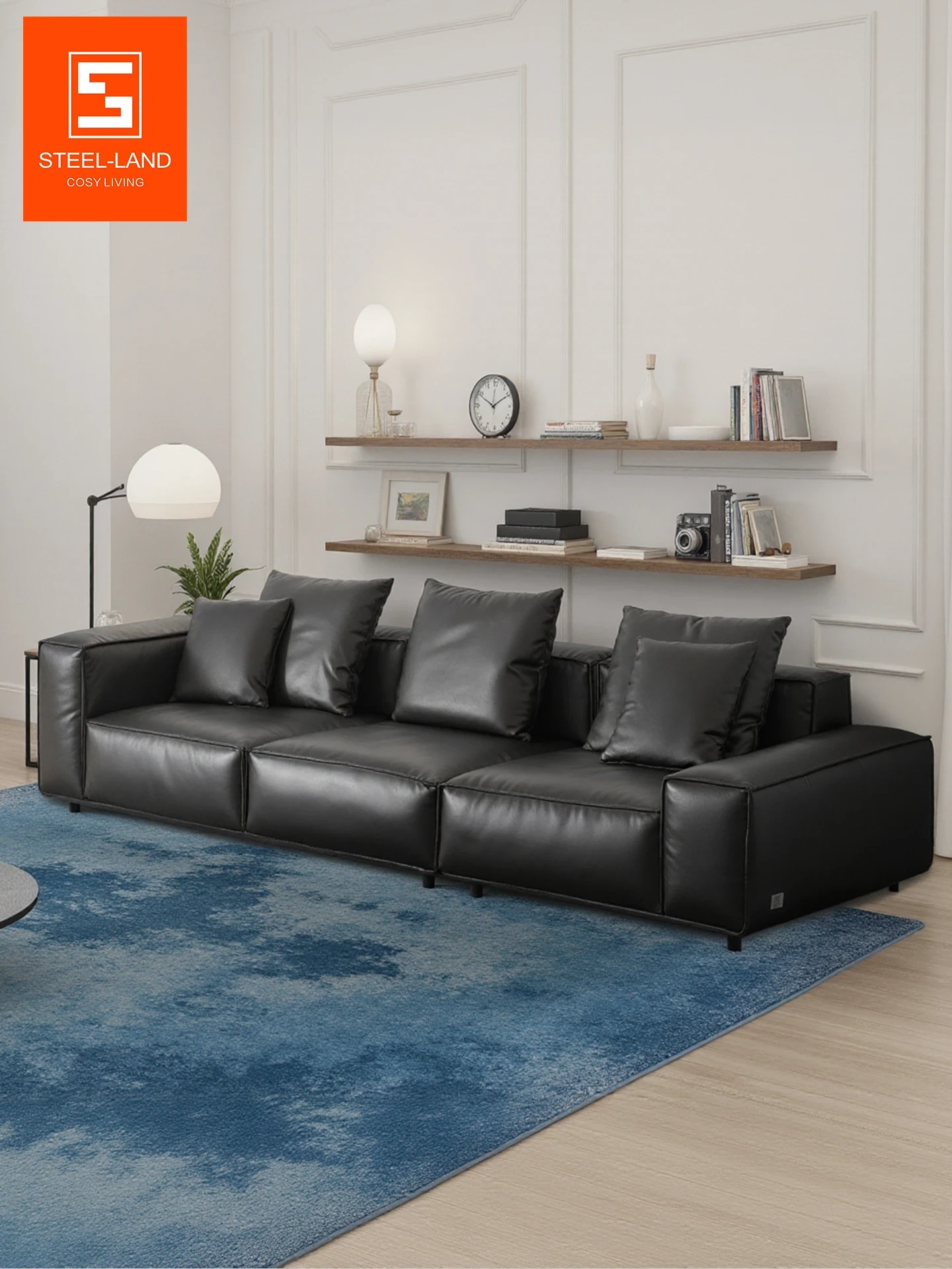 Stylish Black Leather High-Back Sofa - Italian Minimalist Design, Perfect for Your Living Room - Luxurious Genuine Leather Square Sofa by Styrolan