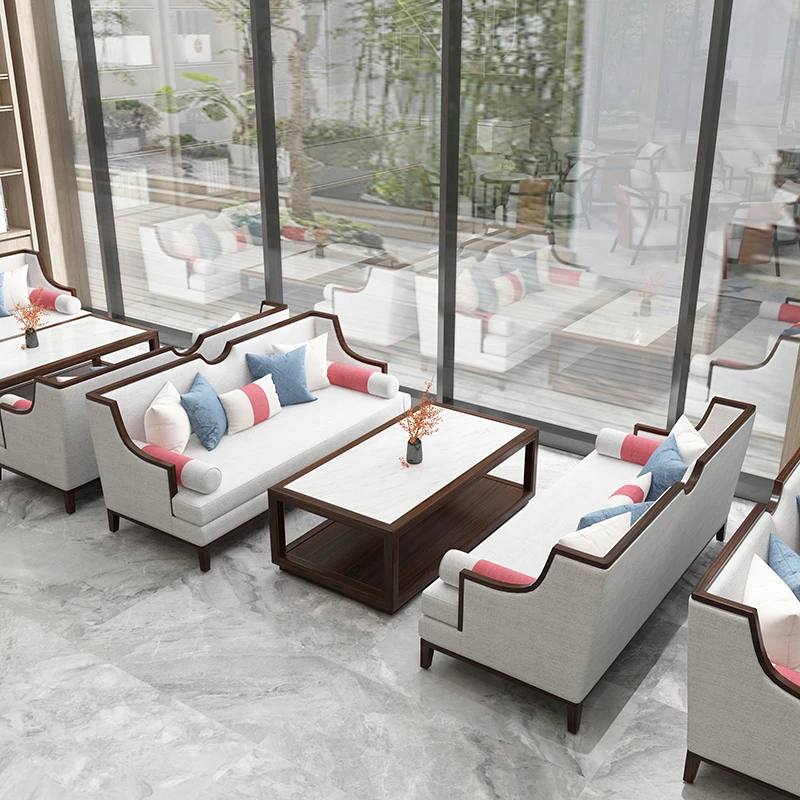 Modern New Chinese Style Solid Wood Sofa Set for Sales Office - Double Three-Person Reception Booth Furniture for Hotels and Clubs
