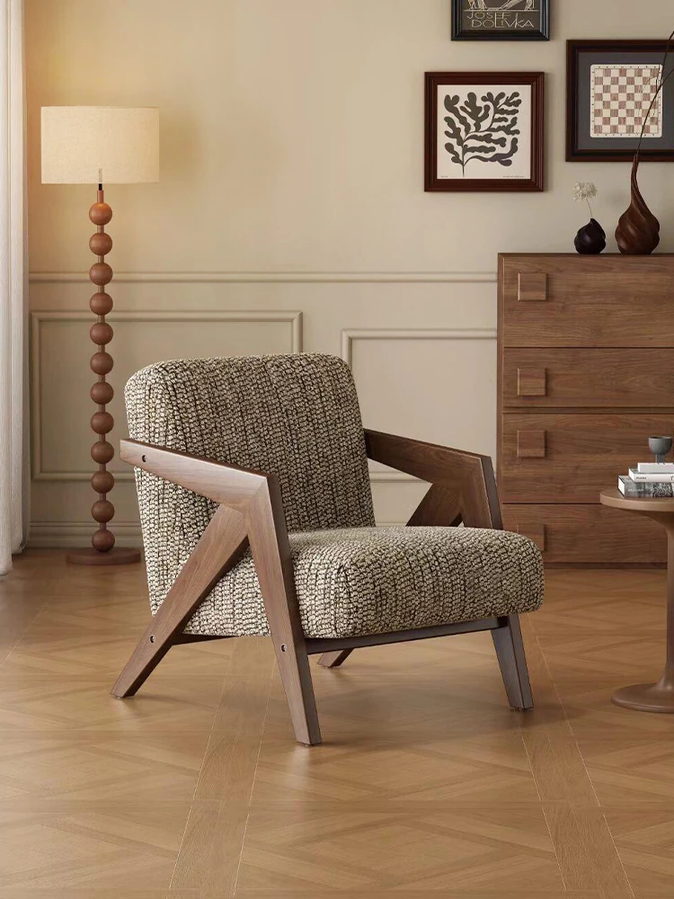 Vintage French Designer Solid Wood Armchair for Living Room and Balcony – Modern Retro Single Seat with High-End Feel, Perfect for Relaxation and Style.